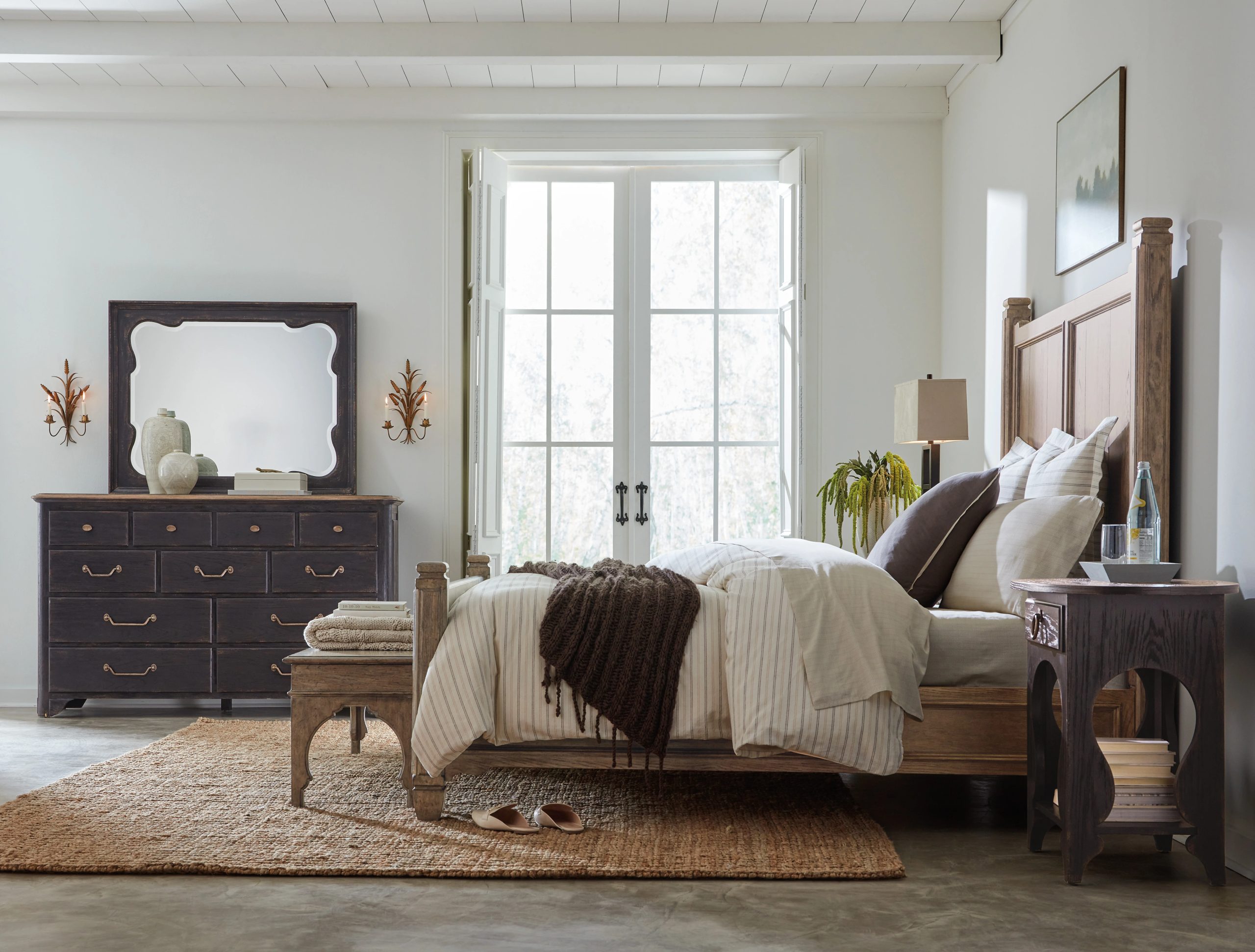 Reimagining a well-loved historical silhouette with a fresh take on finish, function and form, the inviting Americana King Panel Bed has a planked motif on the headboard and footboard, scroll-work on the base of the footboard and caps on the bedposts. Crafted of Oak Veneers, it is finished in the gentle, warm brown Honey finish representing the natural wear one might expect of pieces passed down through the family over time. Headboard can be used alone.