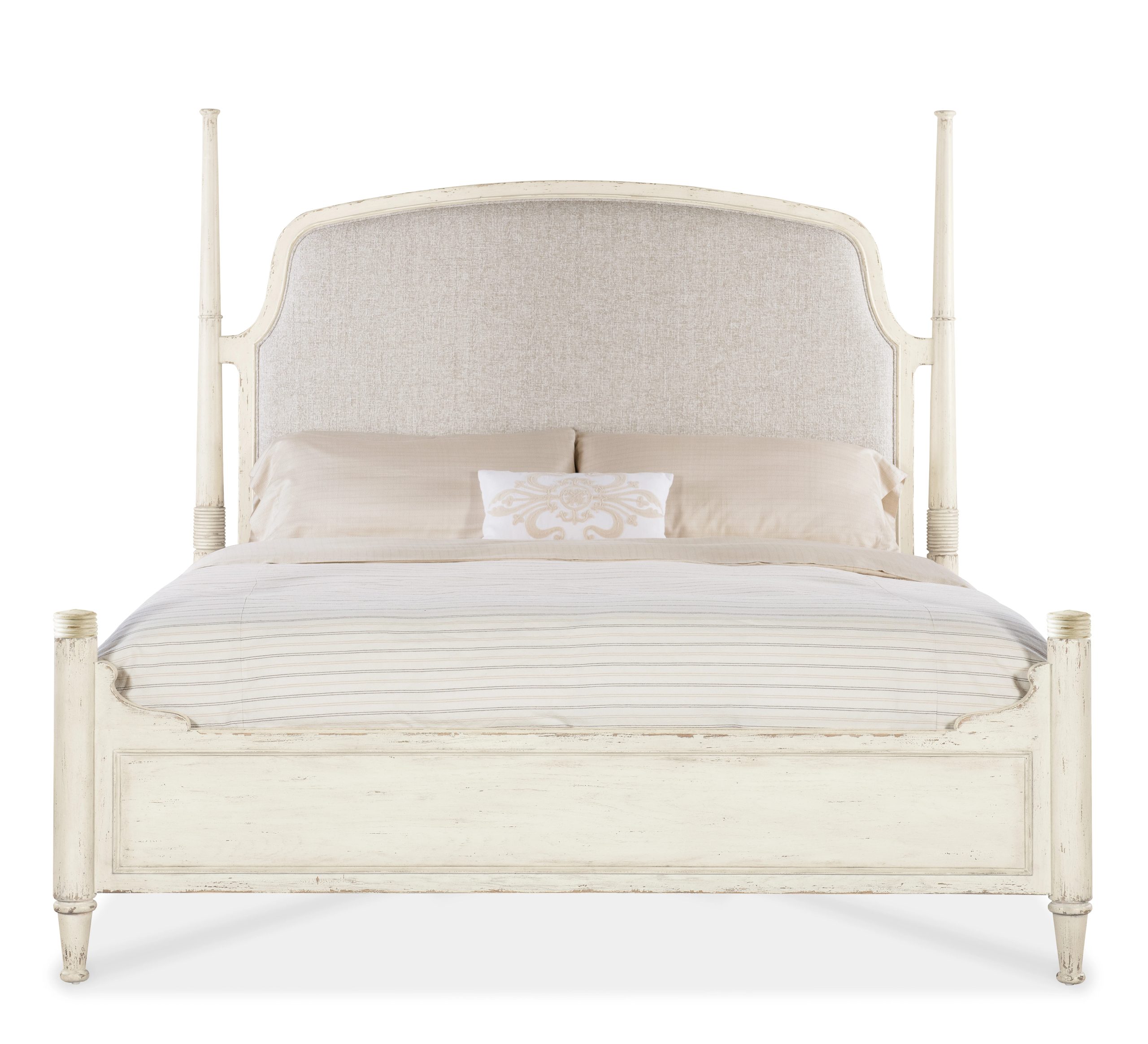 In a stunning reimagination of the classic Southern 4-poster bed, the inviting Americana California King Upholstered Bed has an upholstered fabric headboard with welt trim, in a creamy white color complementing the timeworn white Daisy finish over Cathedral Oak Veneers. There are carved accents on the posts and scroll work on the upper sides of the footboard. The footboard comes with capes for a low-post option.