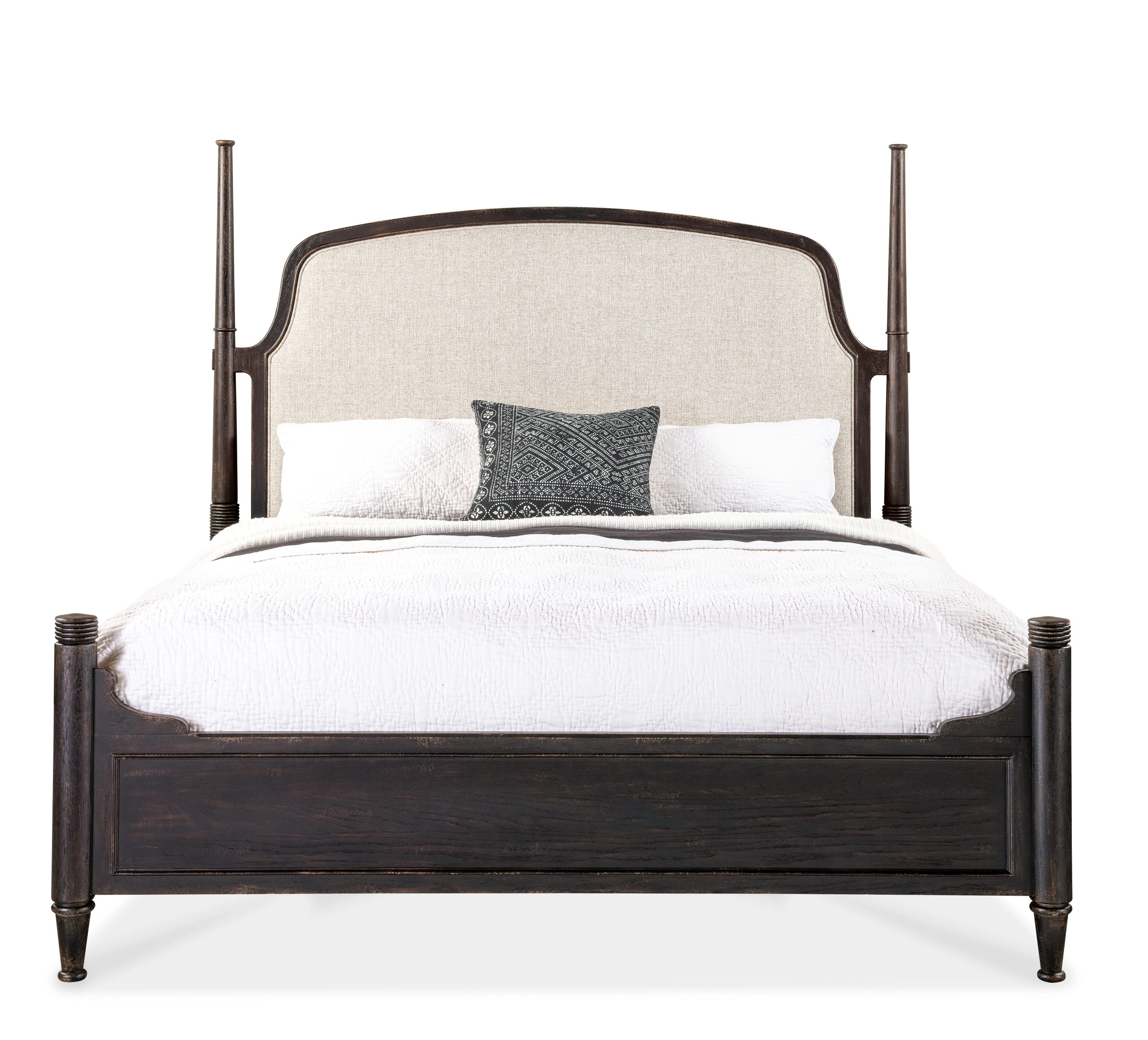 In a stunning reimagination of the classic Southern 4-poster bed, the inviting Americana King Upholstered Bed has an upholstered fabric headboard with welt trim, in a creamy white color contrasting with the deep, dark Molasses finish over Cathedral Oak Veneers. There are carved accents on the posts and scroll work on the upper sides of the footboard. The footboard comes with caps for a low-post option.