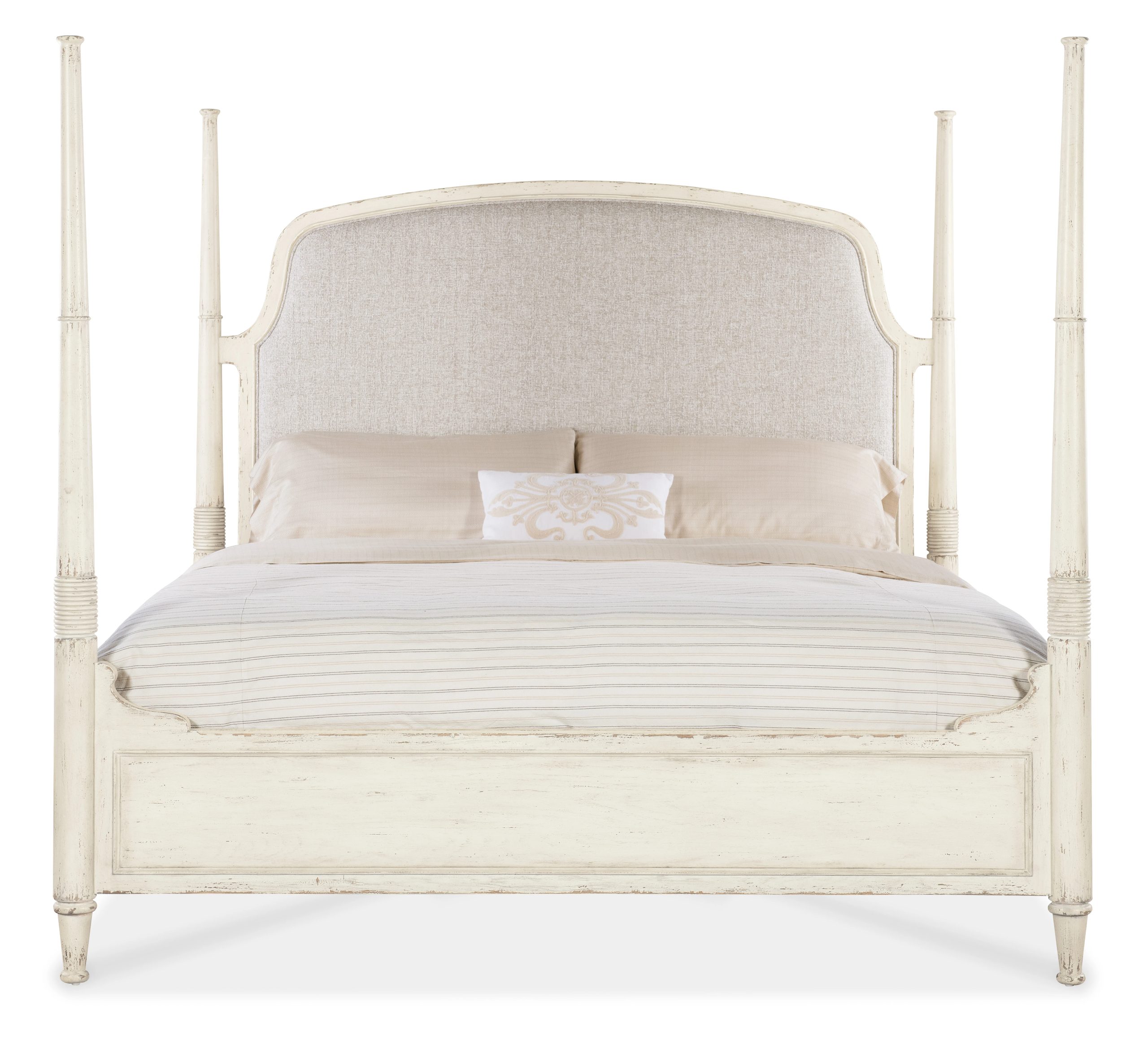 In a stunning reimagination of the classic Southern 4-poster bed, the inviting Americana King Upholstered Bed has an upholstered fabric headboard with welt trim, in a creamy white color complementing the timeworn white Daisy finish over Cathedral Oak Veneers. There are carved accents on the posts and scroll work on the upper sides of the footboard. The footboard comes with capes for a low-post option.