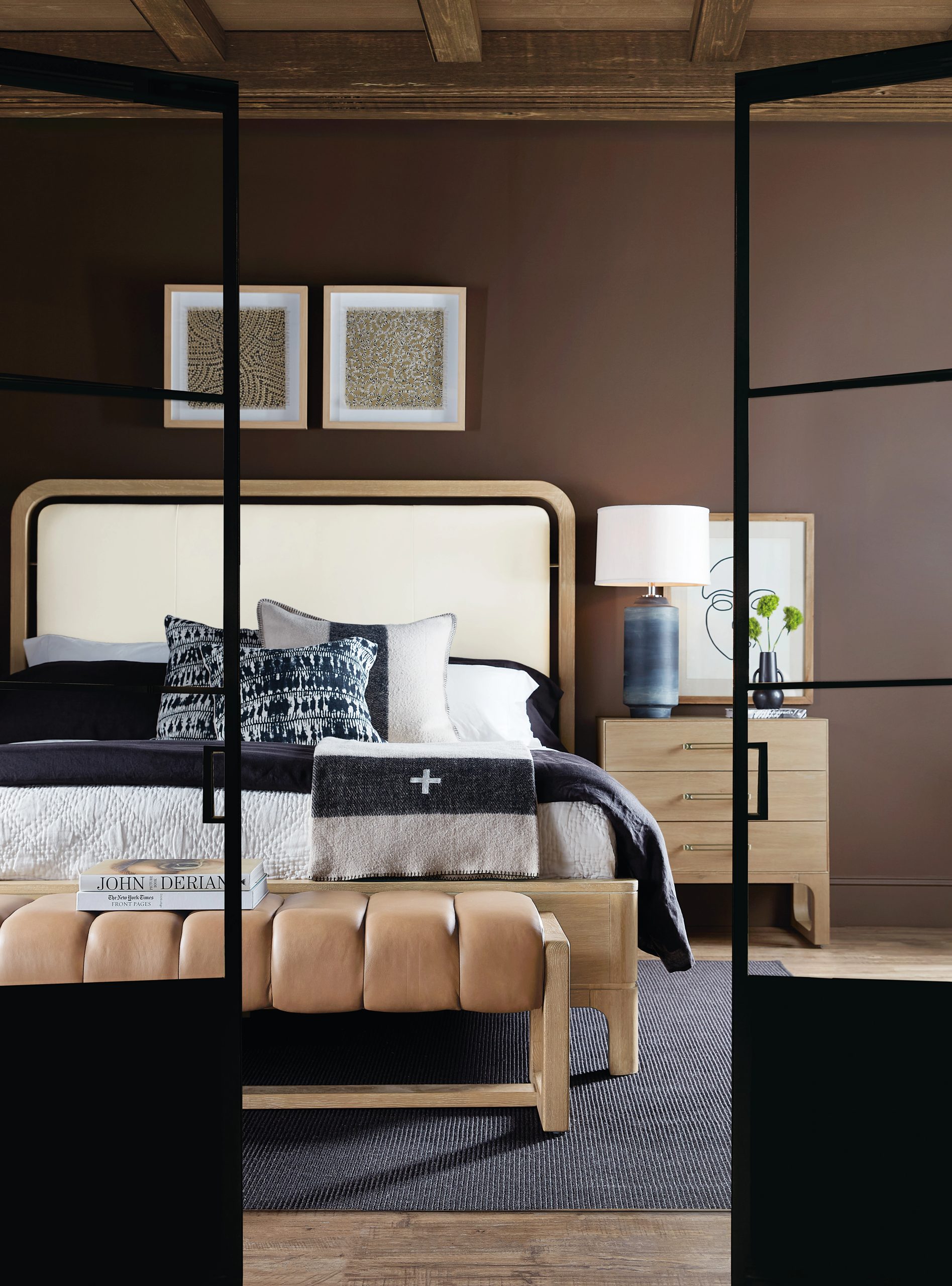 The Banyon Bay California King Panel Bed in the Sunbleached leather offers a luxurious and spacious sleeping experience. Constructed from white oak solids, oak veneers, and finished top-grain leather, it boasts a light Desert Oak finish enhanced by wire-brushing and cerusing. The leather-upholstered headboard features an open frame and metal supports, adding modern sophistication to its natural materials. This California King bed includes a headboard, footboard, and rails, making it a complete and stylish centerpiece for your bedroom.