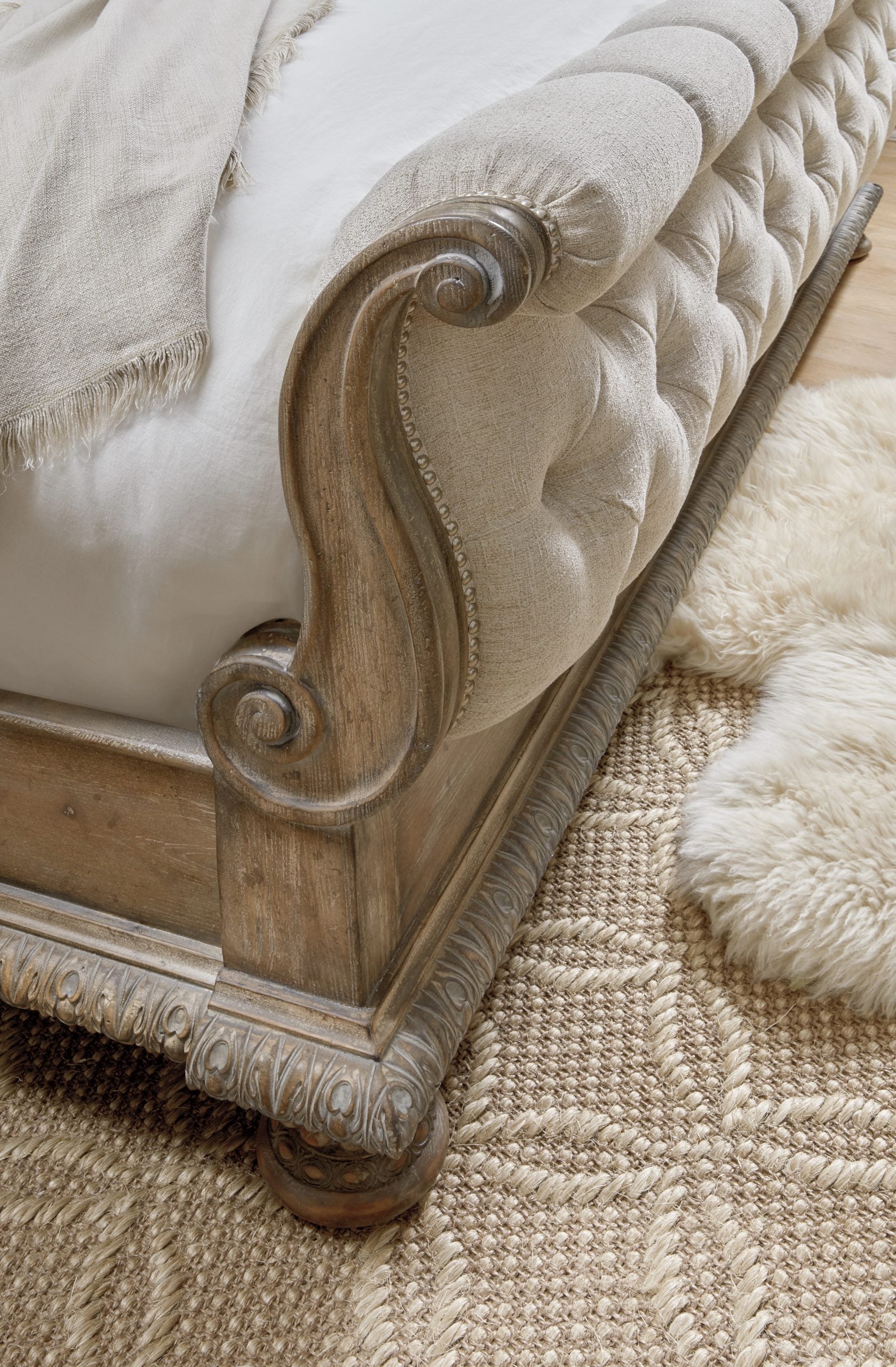 Grand scale and soft, sweeping lines infuse the statement Castella King Tufted Bed with emotion. Upholstered in a beautifully woven multi-dimensional texture fabric in a creamy Natural Tan performance fabric with repeated tufting for a plush appearance, the bed is easily mixed with any color scheme. Acanthus leaf carving detail around the base of the bed adds the final touch of classic appeal to this over-the-top bed. Includes headboard, footboard and rails.