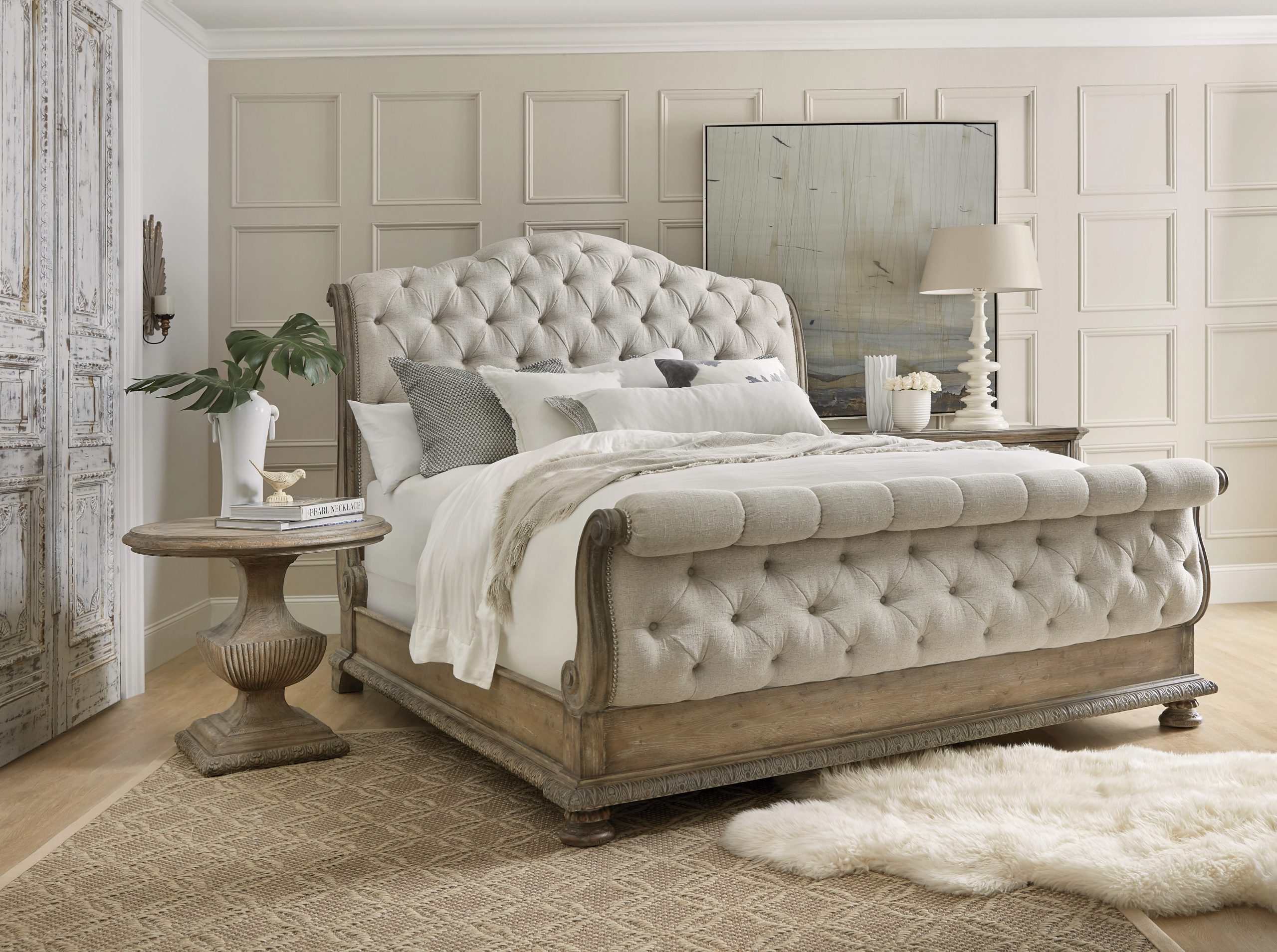 King upholstered bed with repeated tufting and soft, sweeping lines in a creamy beige performance fabric; acanthus-carved base and pecan veneer accents, includes headboard, footboard and rails.