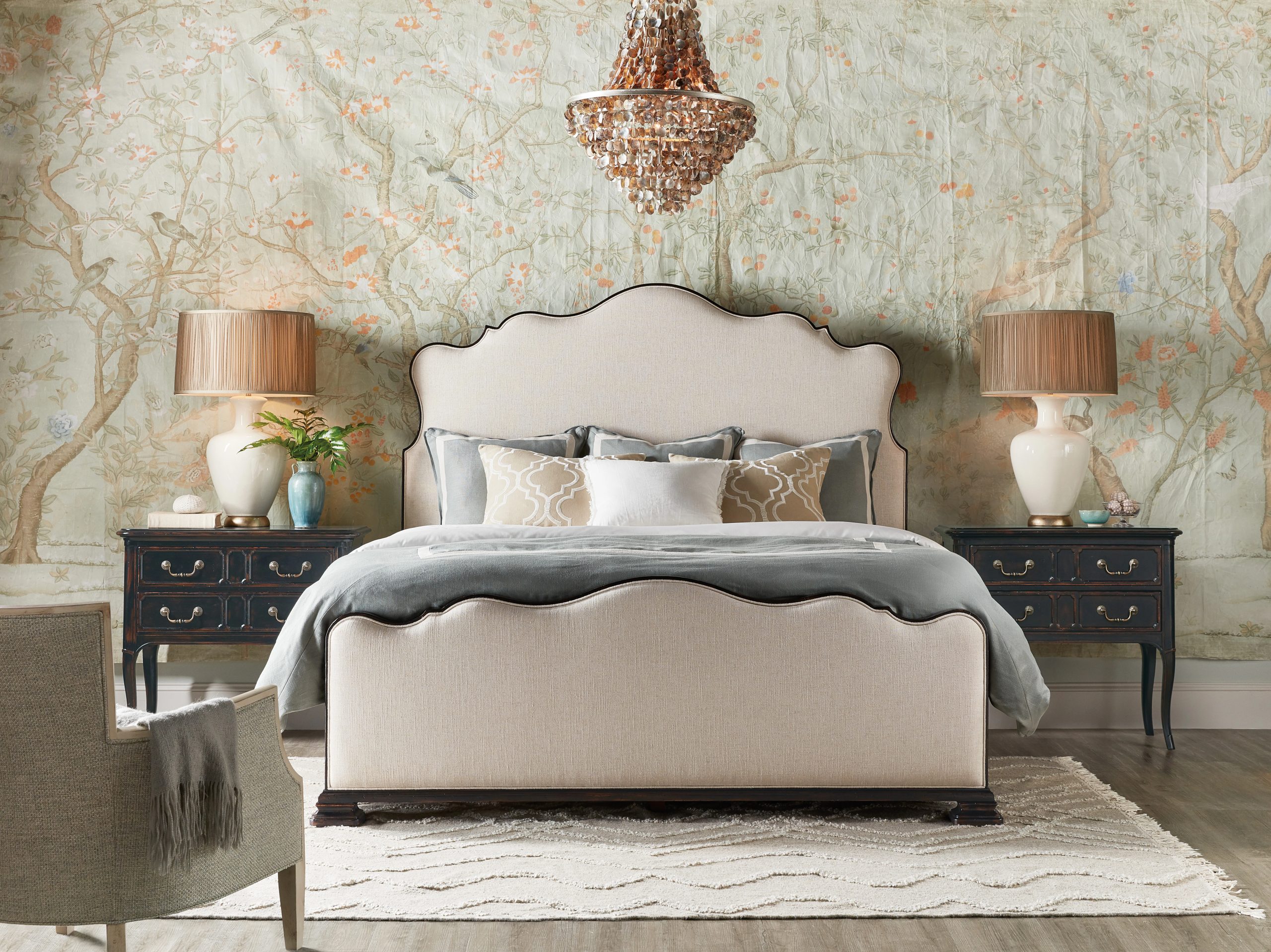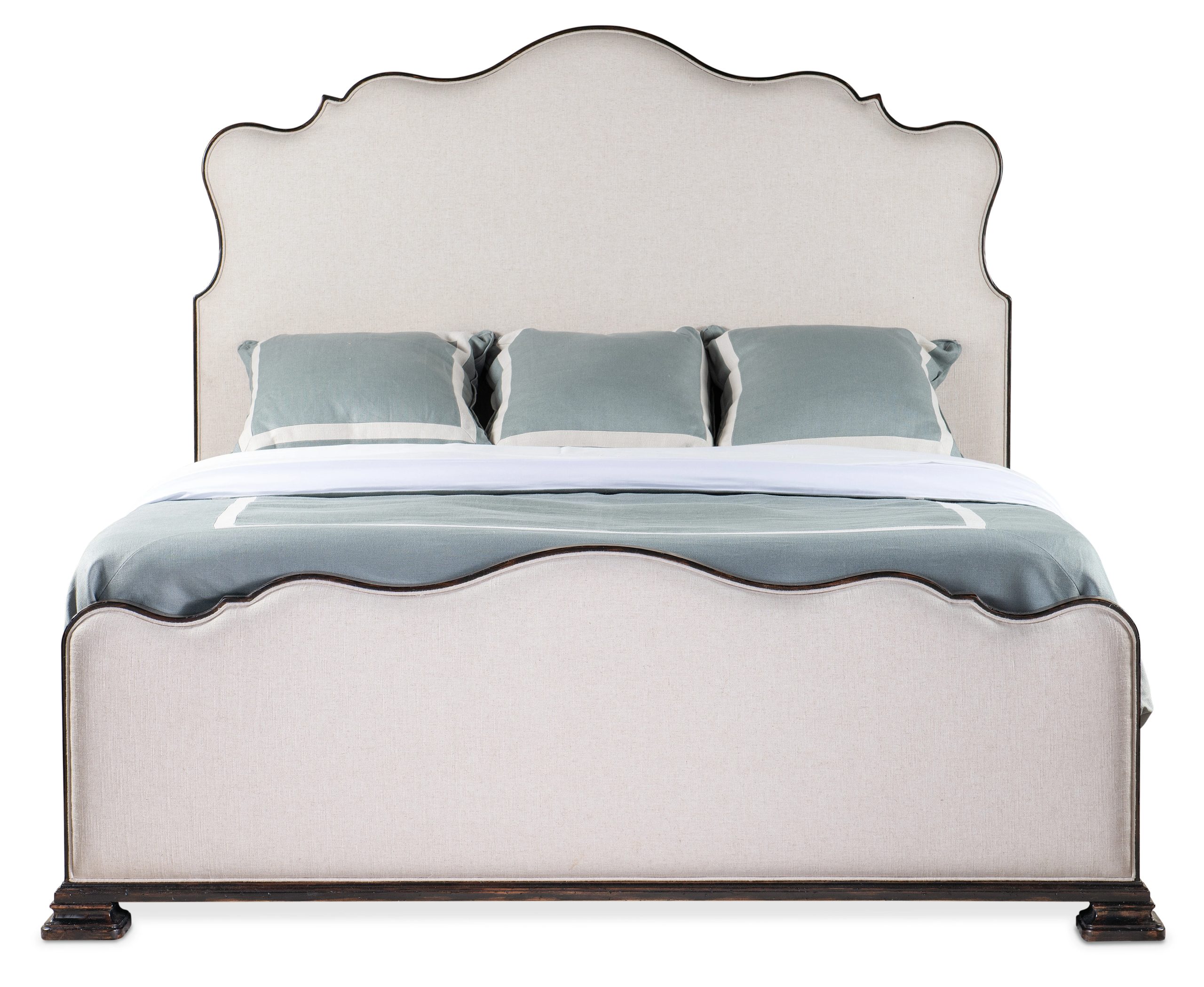 The stunning Charleston King Upholstered Bed marries a traditional soul with a hint of cosmopolitan chic. Contrasting the rich Black Cherry heirloom finish on the wood trim, side panels and feet with the Chateau Linen upholstery on the scalloped-edge headboard and footboard, the bed is crafted of Cherry Veneers and fabric.