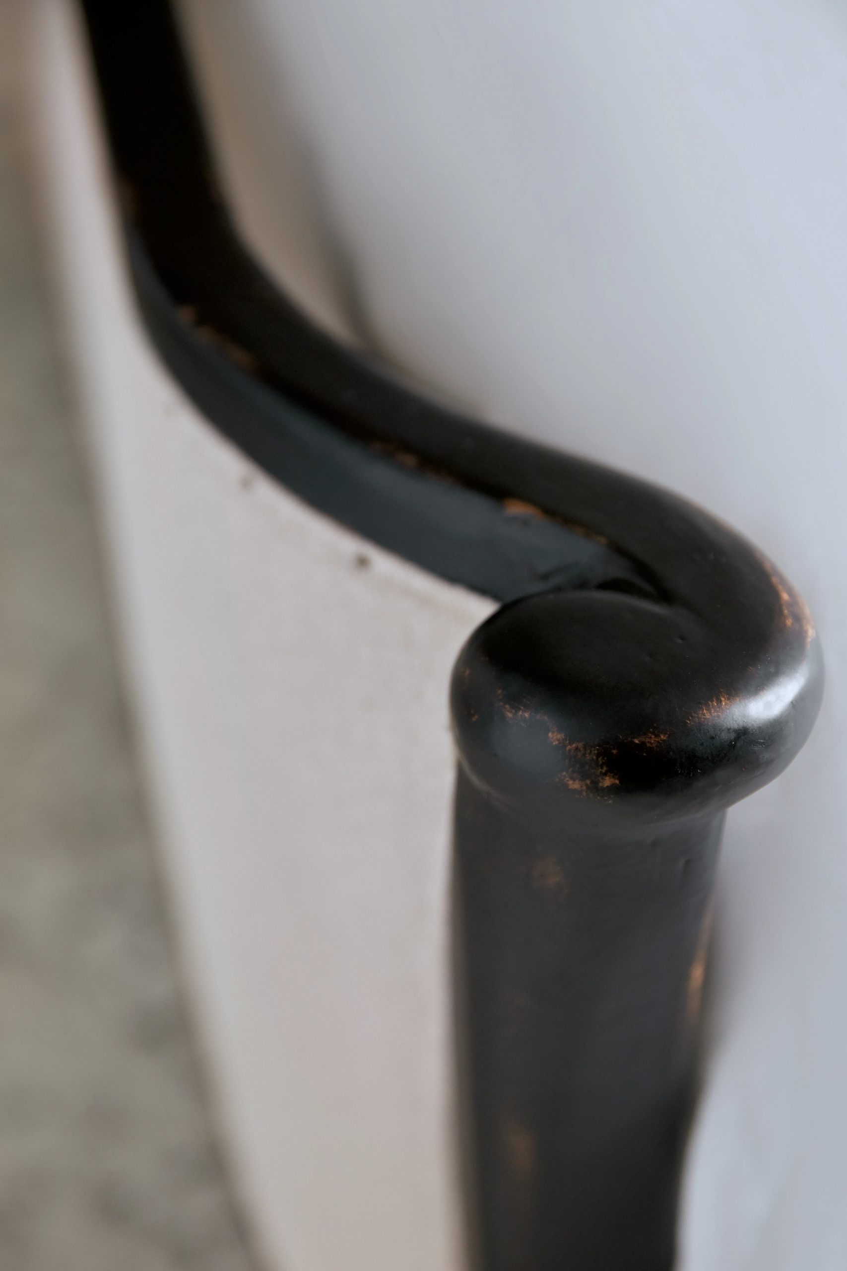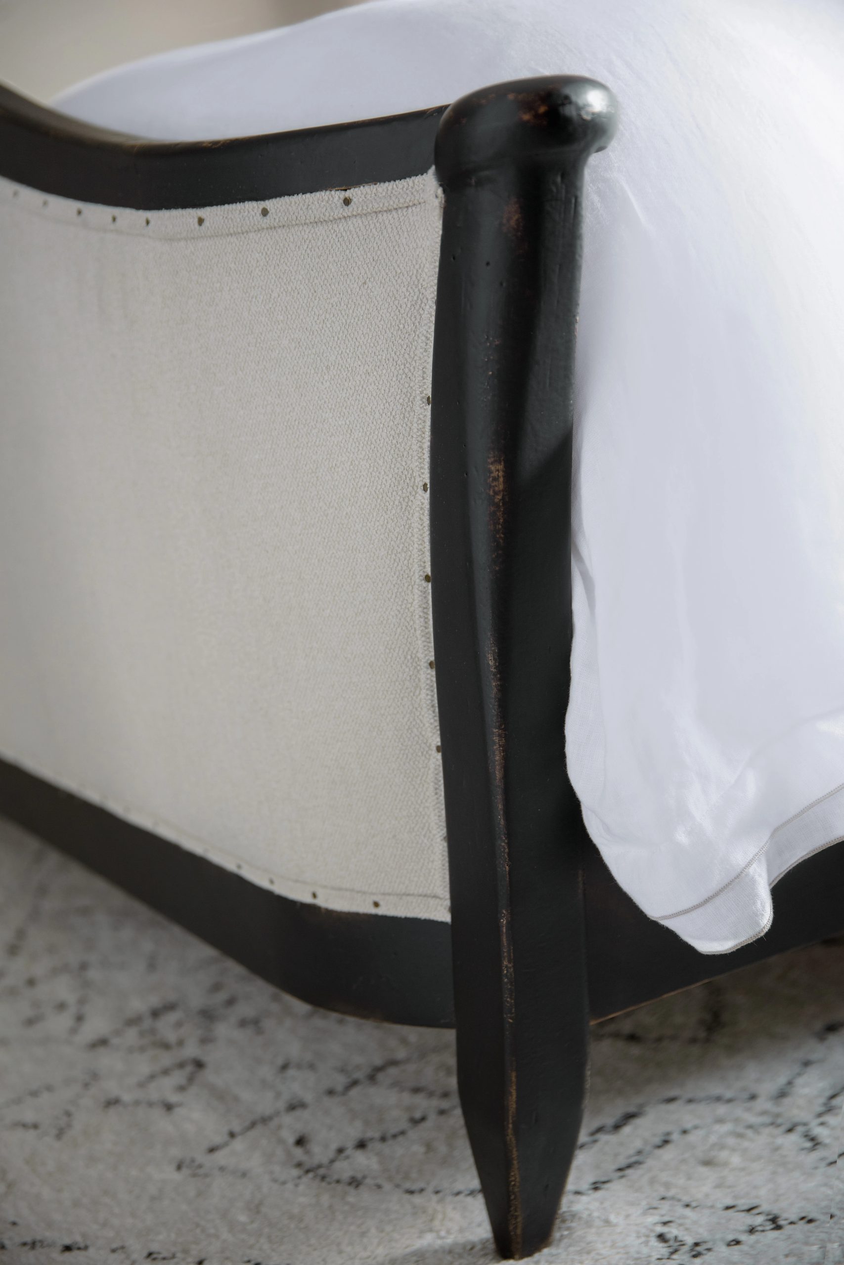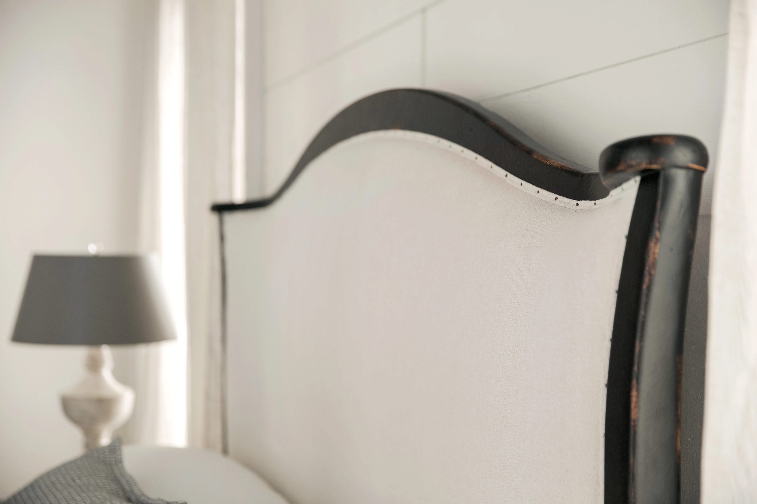 Romantic King upholstered bed with a sweeping, shaped headboard and footboard in creamy Tuscan White, framed in a hand-chiseled black finish with nailhead trim. Includes headboard, footboard, and rails.