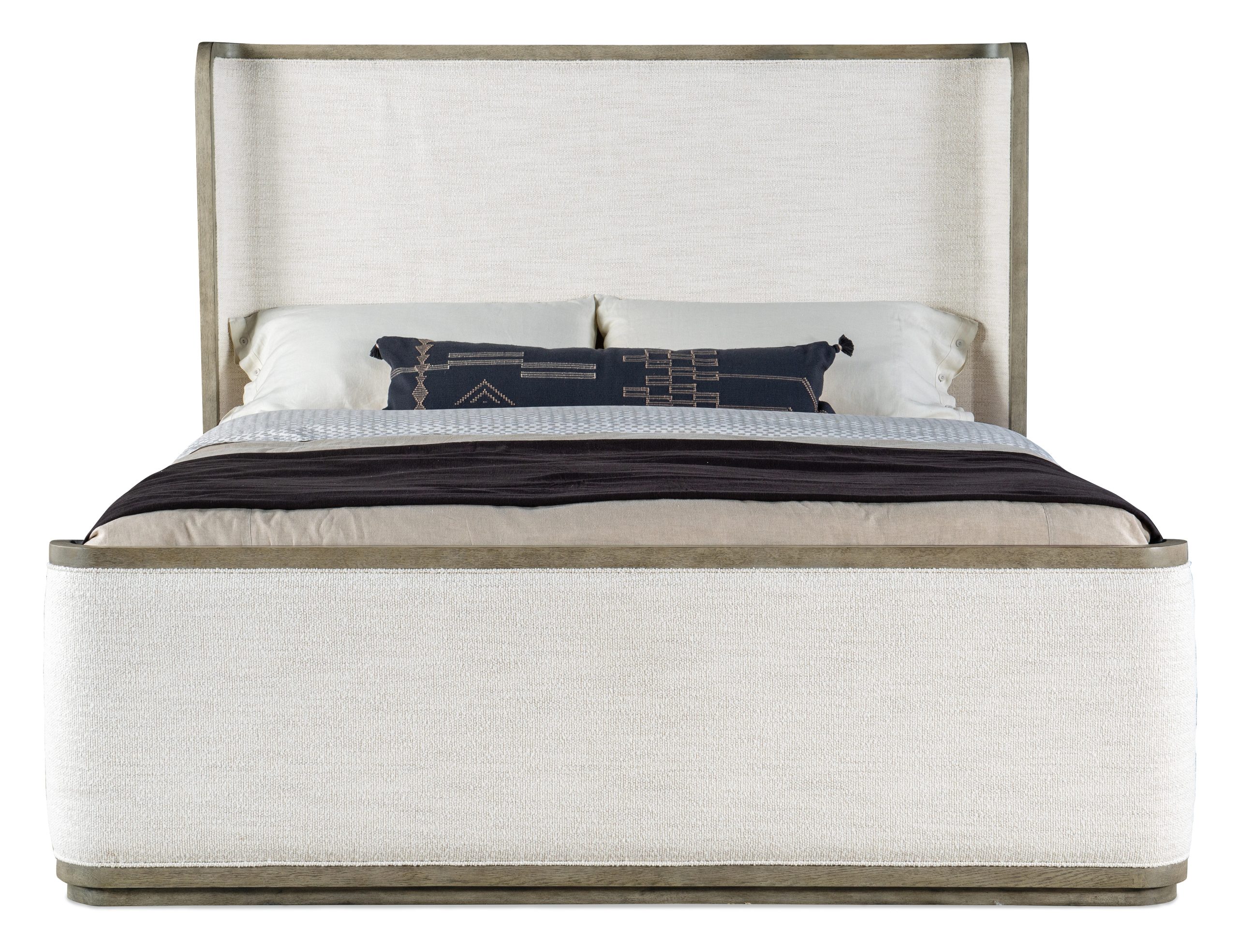 Modern sleigh-style shelter bed featuring a wood-bordered headboard, footboard and rails upholstered in soft neutral performance fabric. Includes headboard, footboard and rails; medium wood finish suits casual bedrooms.