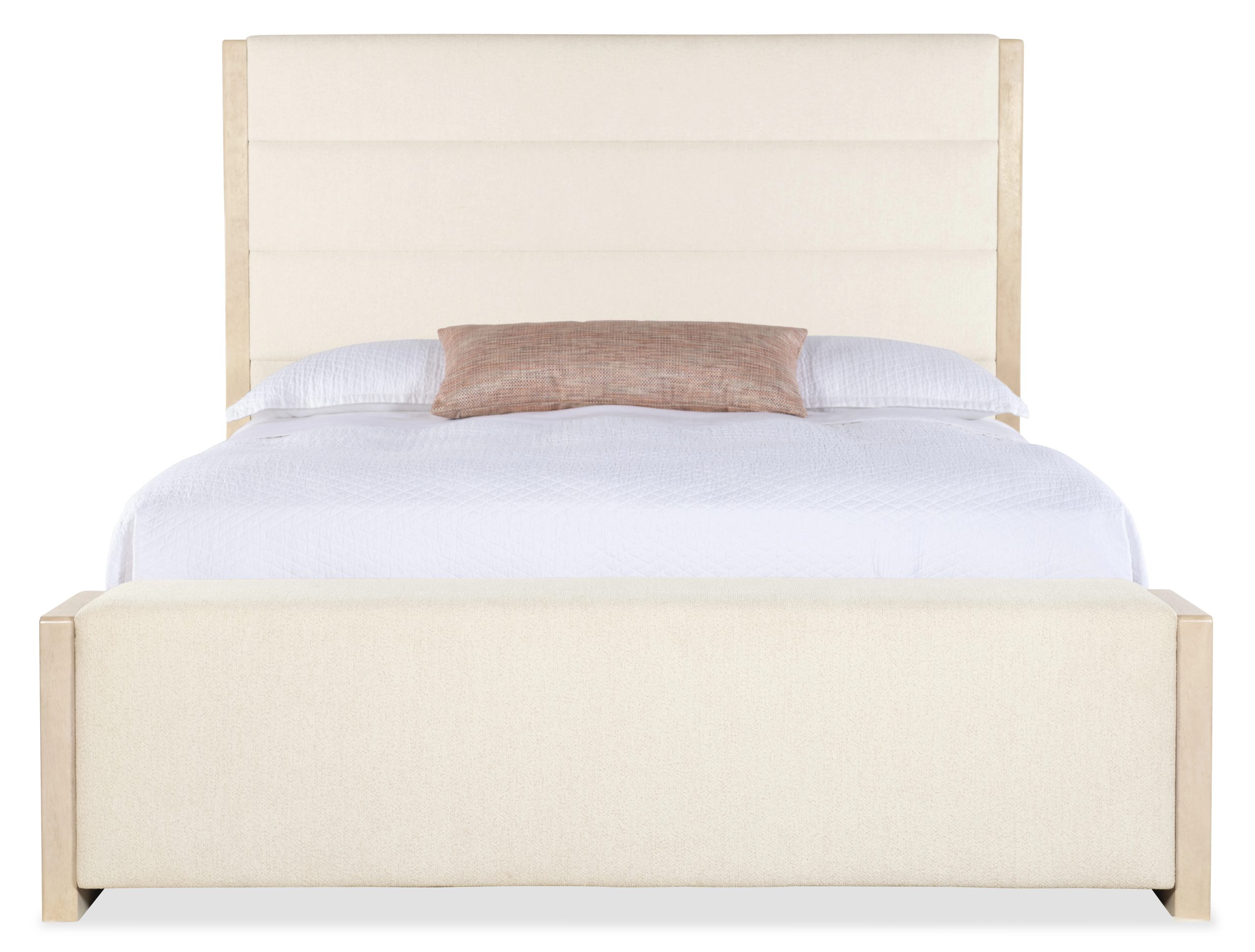 Queen upholstered storage bed with performance fabric and horizontal channels, set on quartered oak veneers in a Polished Limestone finish. Upholstered bench footboard conceals storage drawers on each side.