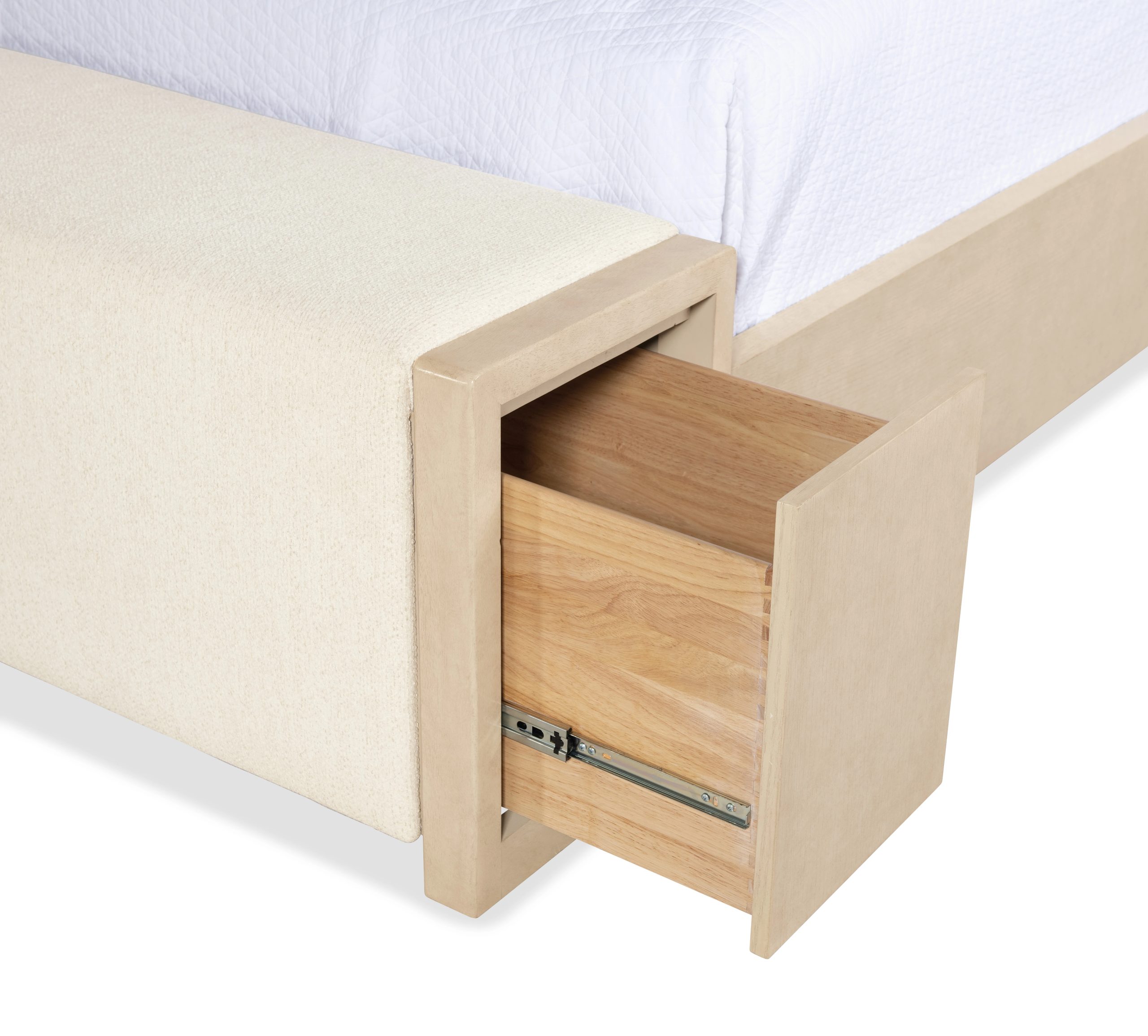 | Queen sizePerformance fabric upholsteryUpholstered bench footboard with hidden storage drawers on each sideFinish: Polished Limestone finish on quartered oak veneers | Yes |
