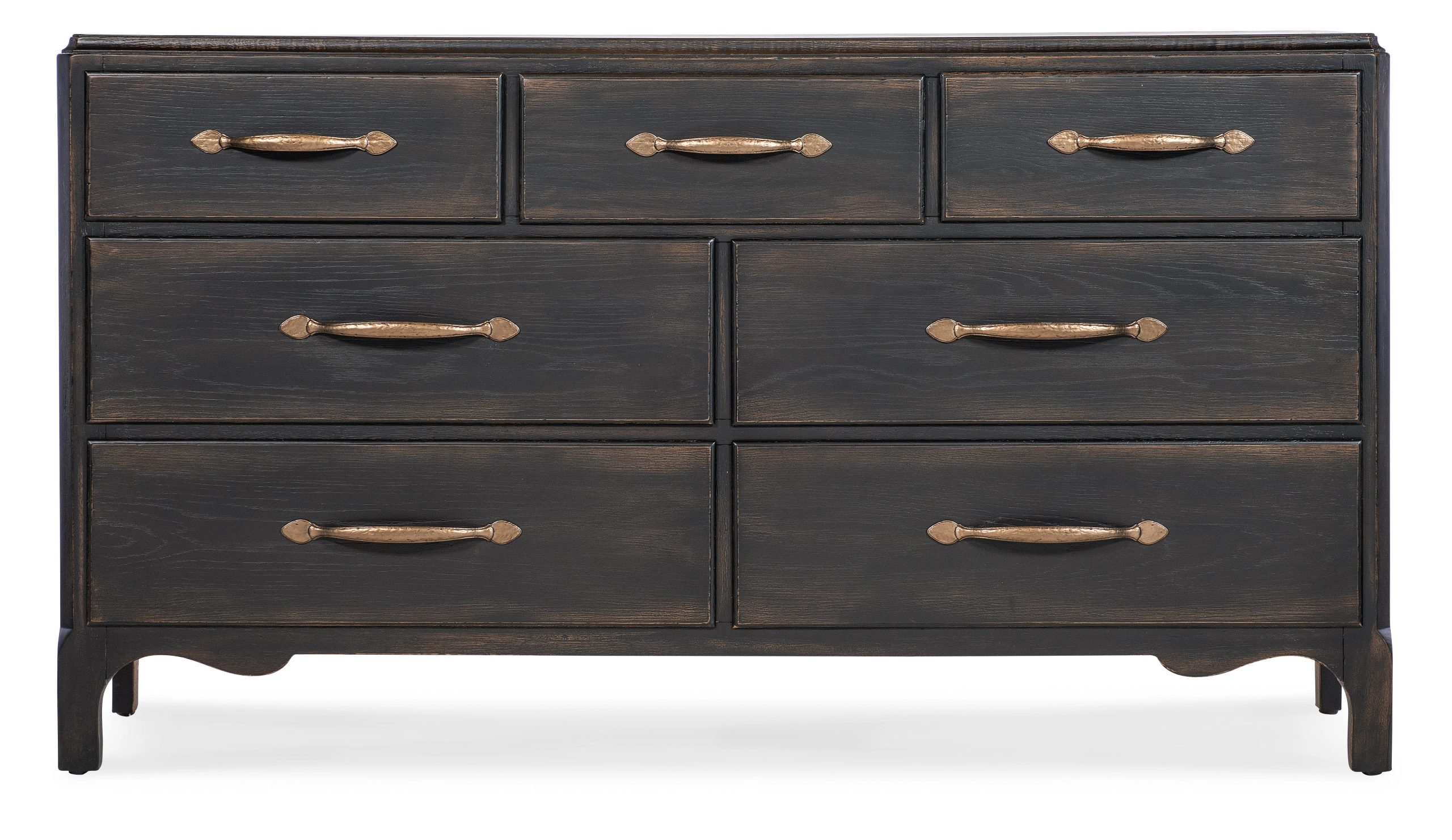 In a classic, charming design with a nostalgic flair, the American Dresser is crafted of Oak Veneers with a Solid-Wood Edge Top, a scalloped-shape base and finished in the deep, dark Molasses finish. There are 7 self-closing drawers, with the top left and right drawers with black removable felt liners. The center drawer has a black liner and black removable jewelry tray. The bottom two drawers are cedar-lined. Metal alloy pulls are in an antique bronze finish.