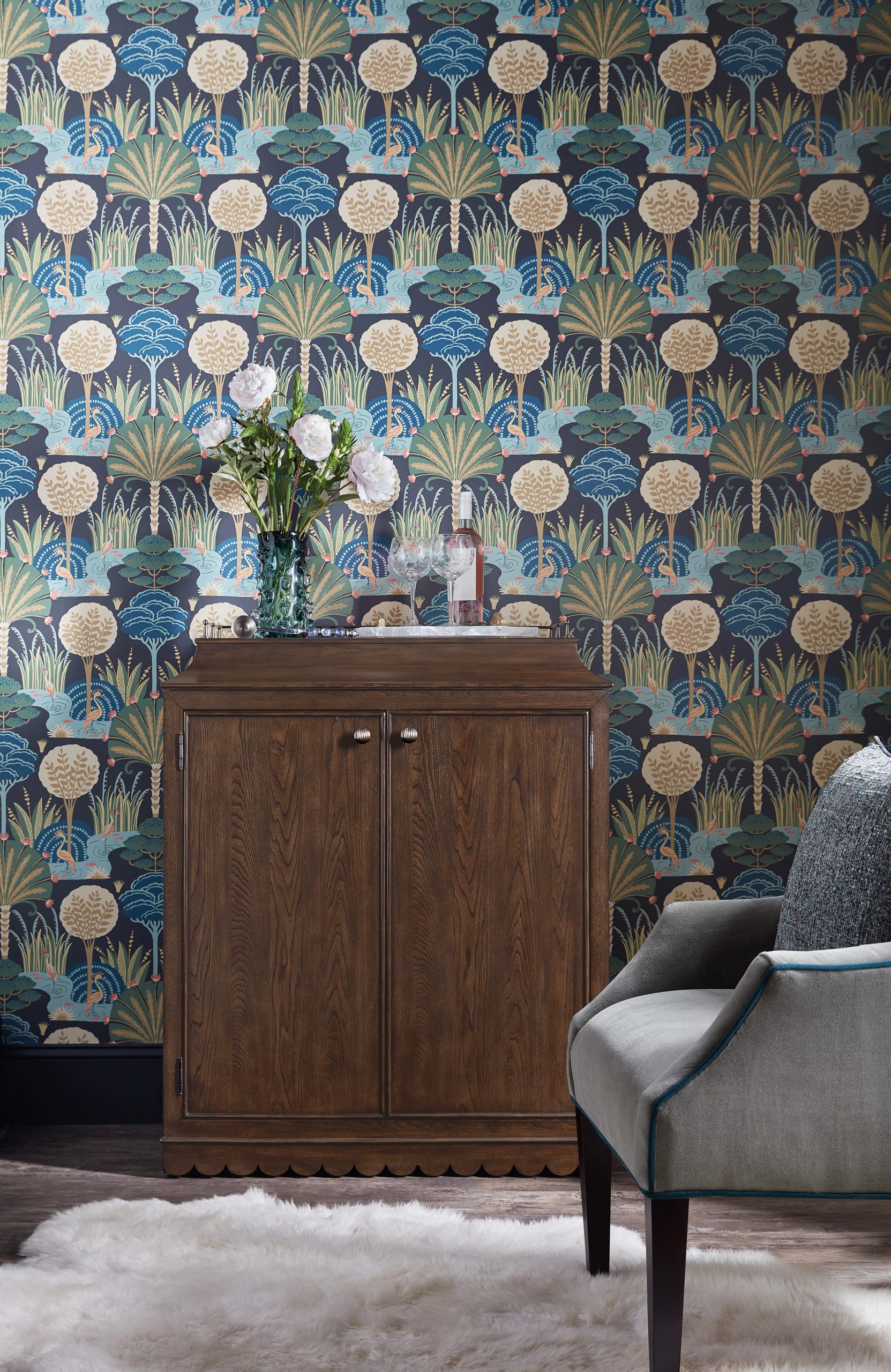 In a classic and classy silhouette, the Dukes Bar Cabinet is functional and chic. Crafted of Elm Veneers with a rich dark finish, it has a gold metal gallery back on the top, two doors with magnetic catches and a scalloped apron around the bottom. Behind the doors are three wine glass racks, one adjustable wood shelf and an open storage area. There’s a pullout drawer for bottle storage that holds up to 8 bottles, and a hidden top drawer with finger pulls and removable black felt liner.