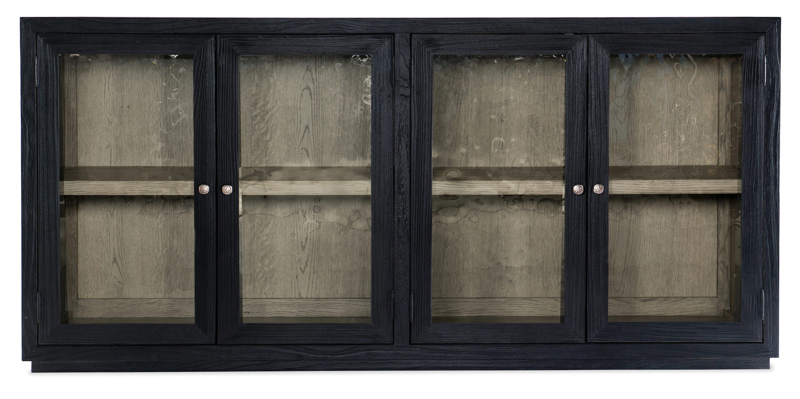 Server sideboard in charred black Shou Sugi Ban finish with four wood-framed seeded glass doors. Two adjustable shelves behind each pair and a Mink-finished interior with antique pewter textured metal bar pulls.
