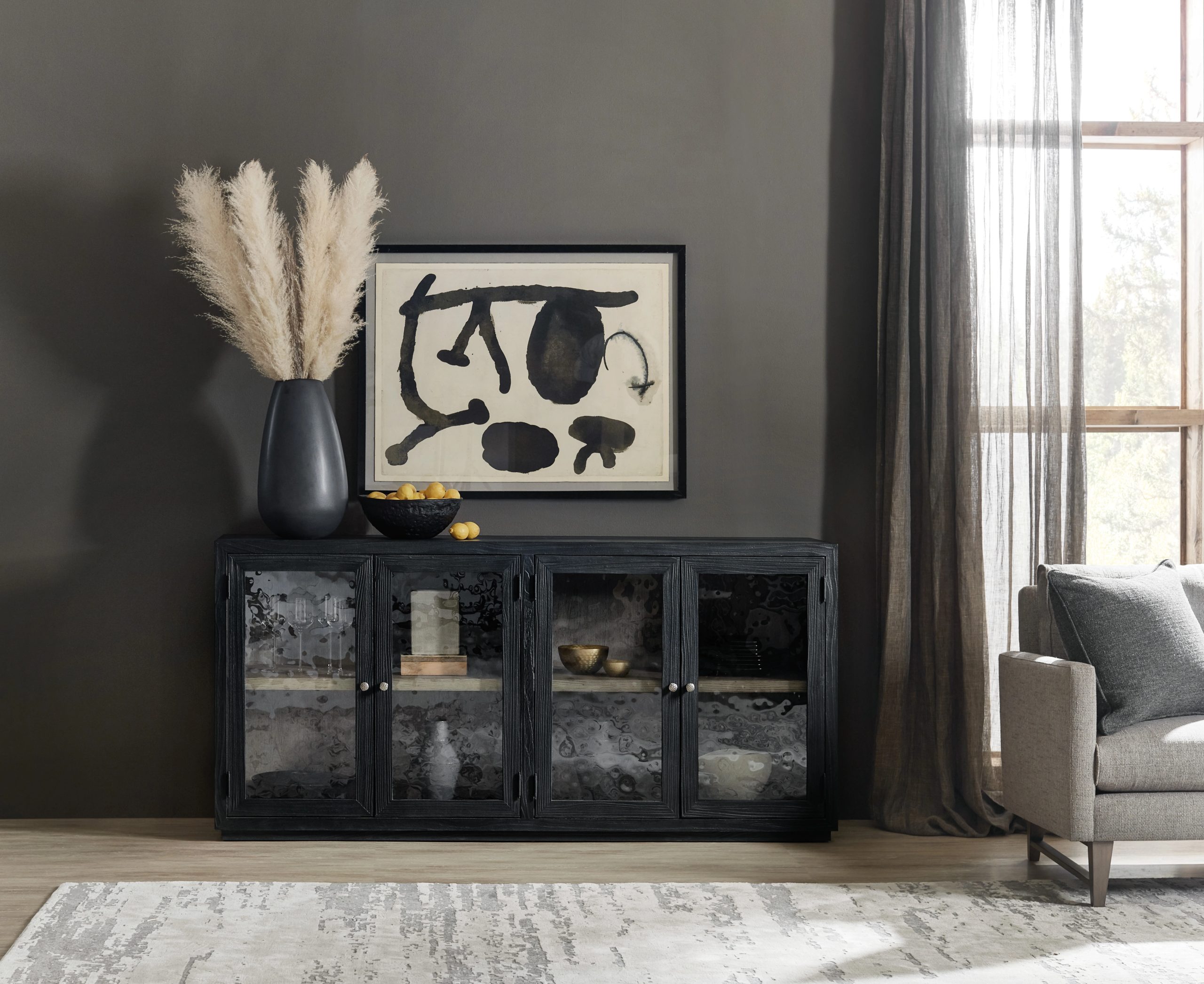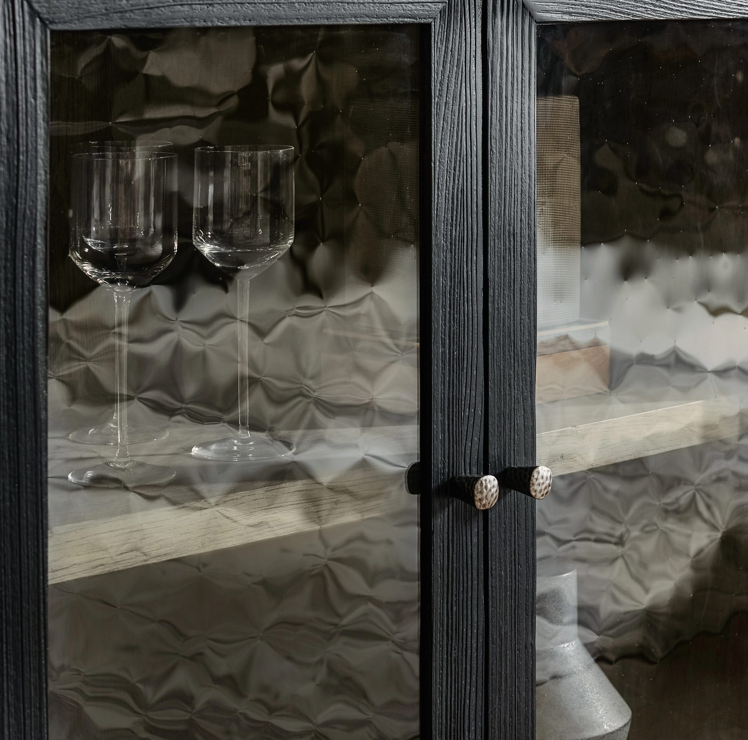 | Four wood-framed doors with seeded glass insertsTwo adjustable shelves behind each pair of doorsInterior is finished in Mink, a soft smoked gray finishFinish: Shadow: a charred black finish achieved through Shou Sugi Ban, a Japanese technique that creates | Yes |