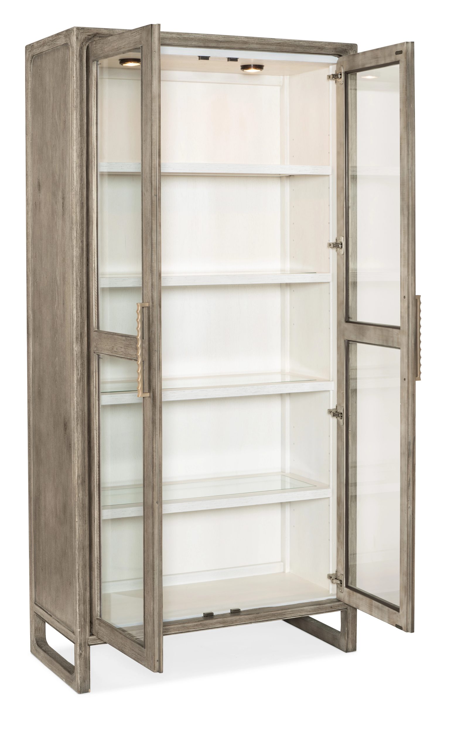 Gray-washed oak display cabinet with wood-framed tempered-glass doors and four glass shelves. Soft-close hinges and two lights with three-level touch control.
