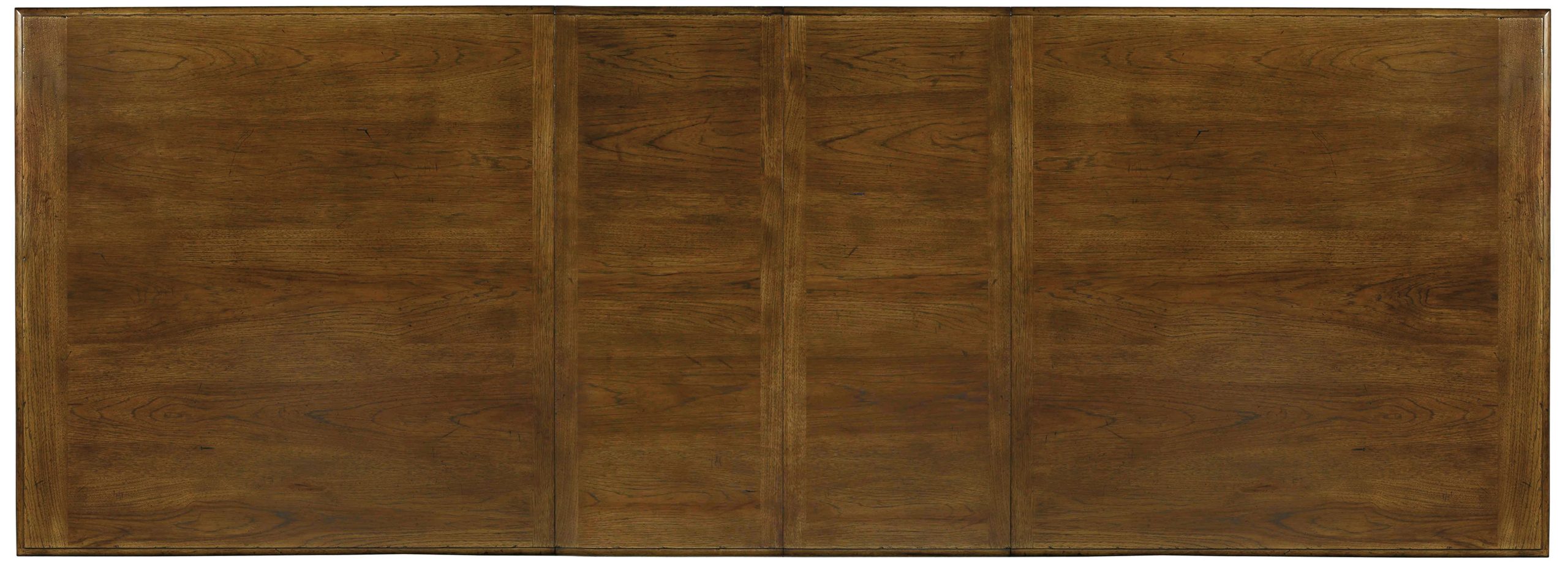 Farmhouse trestle dining table in a soft pecan finish over Pecky Pecan veneers. Includes two 18 in. leaves to extend to 122 in. for large gatherings.