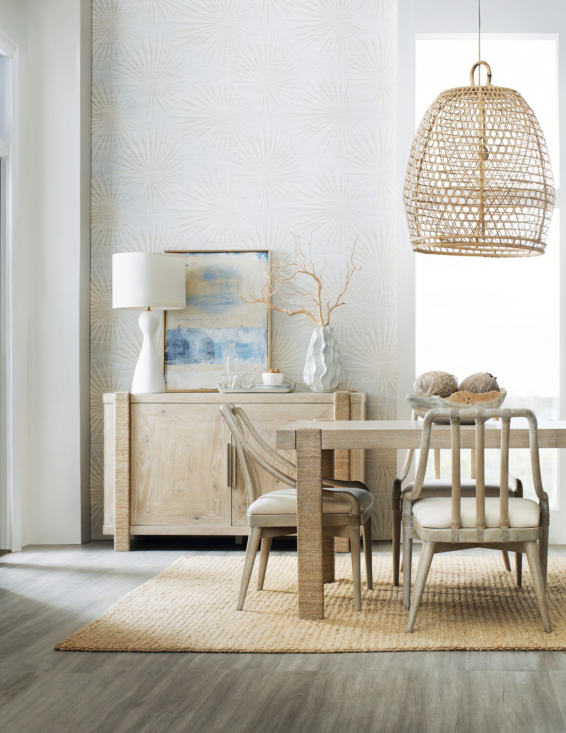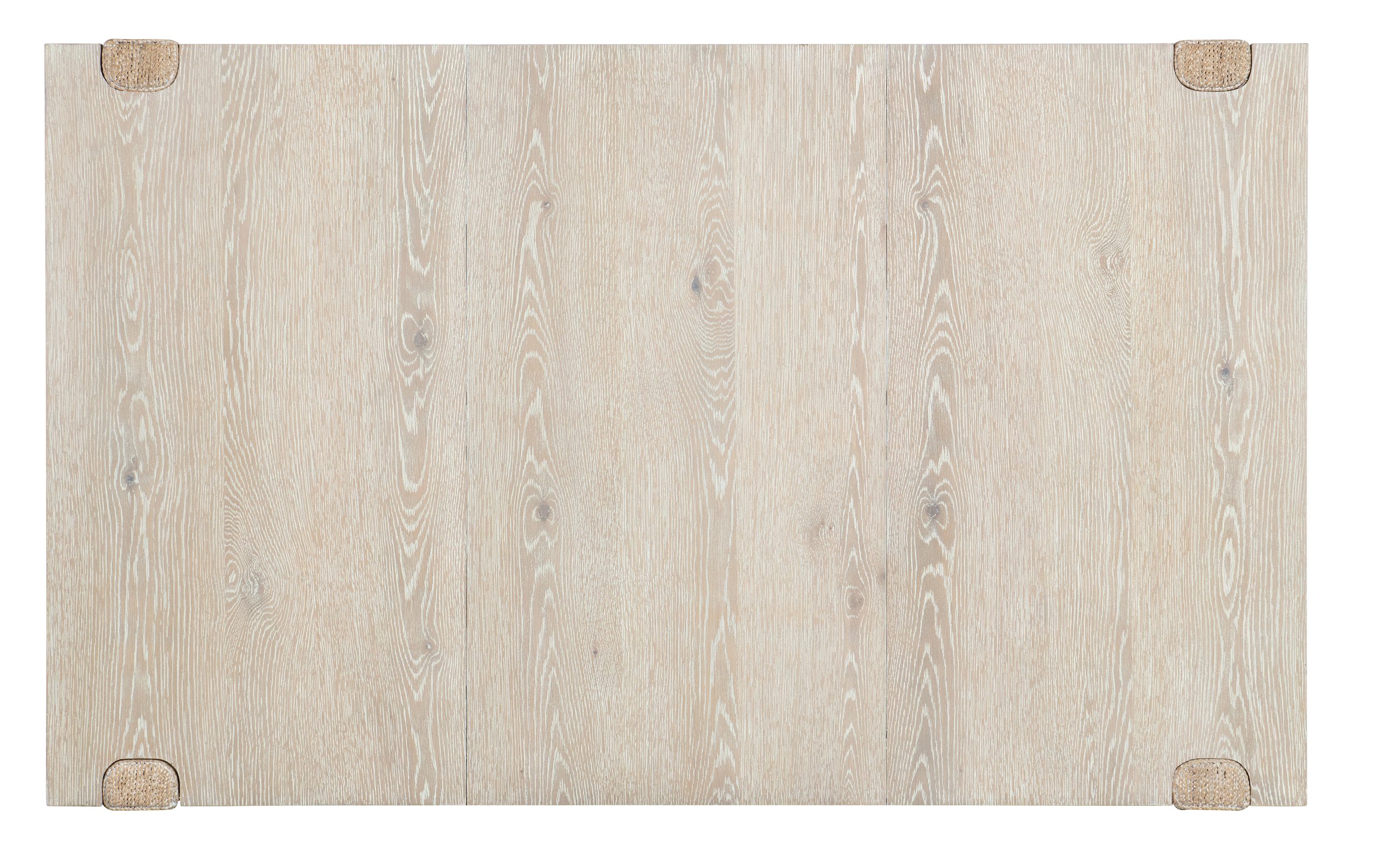 Oak Veneers and Rope come together to create a tactile, organic and serene design in the Seaside Dining Table. Crafted of Oak Veneers, it has a natural light and transparent finish to reveal color and grain variances and is accented by distinct rope-wrapped legs. The 22-inch leaf extends the table to 77 inches long with the leaf in place.