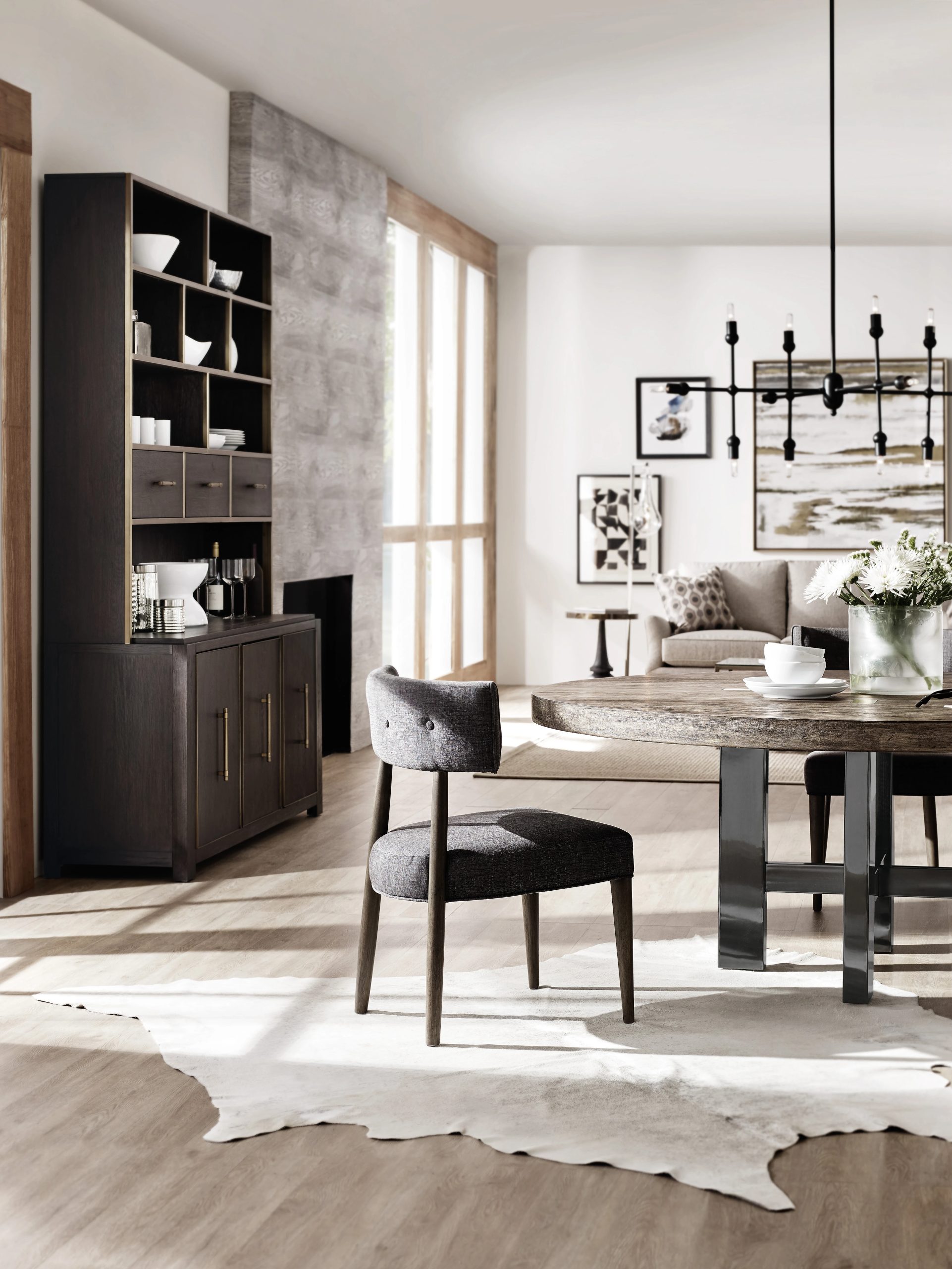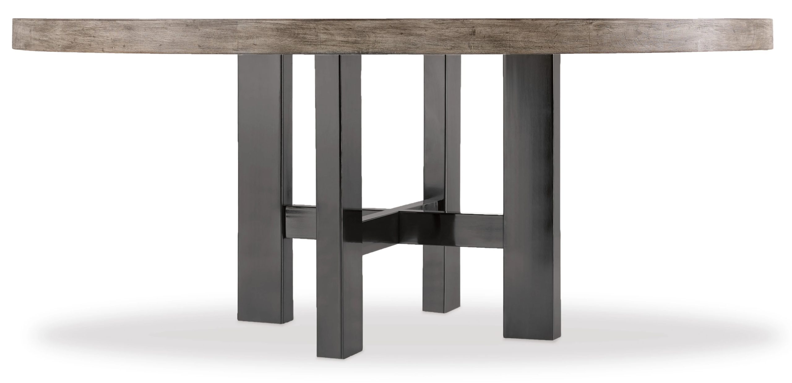 The round dining table in 72-inch and 60-inch sizes combine the Mountain Modern finish on top with a plated black nickel base.