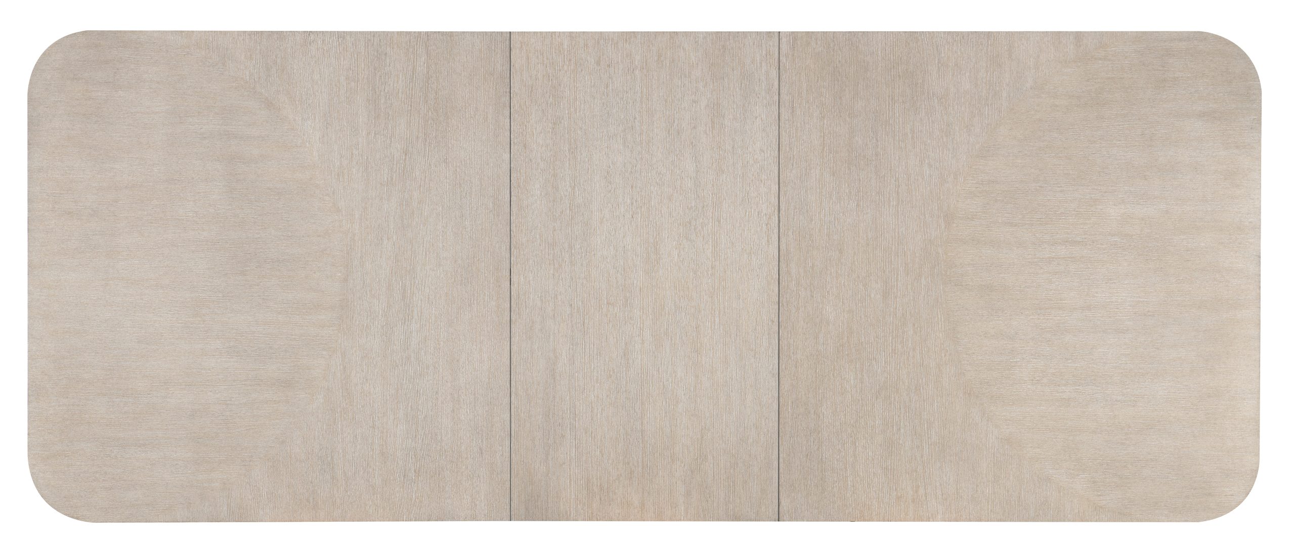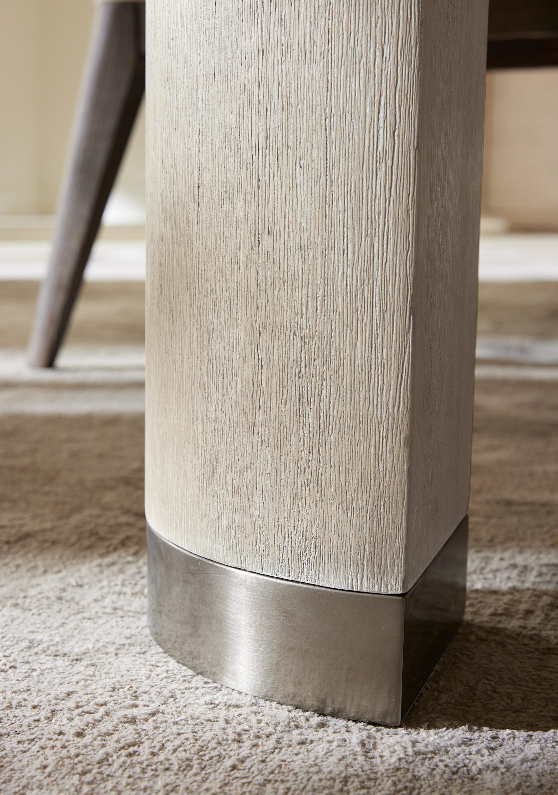 Inspired by decades of design movements with an unmistakably modern aesthetic that transcends time, the Modern Mood Leg Dining Table is a striking, softly sophisticated profile. Featuring a rounded table apron and corners, matched veneers on the top and metal banding accents on the legs in a warm pewter finish, it is crafted of Quartered Oak Veneers in a Diamond Finish with crystal-like alabaster hues. With one 24-inch leaf, the table extends up to 110 inches long.