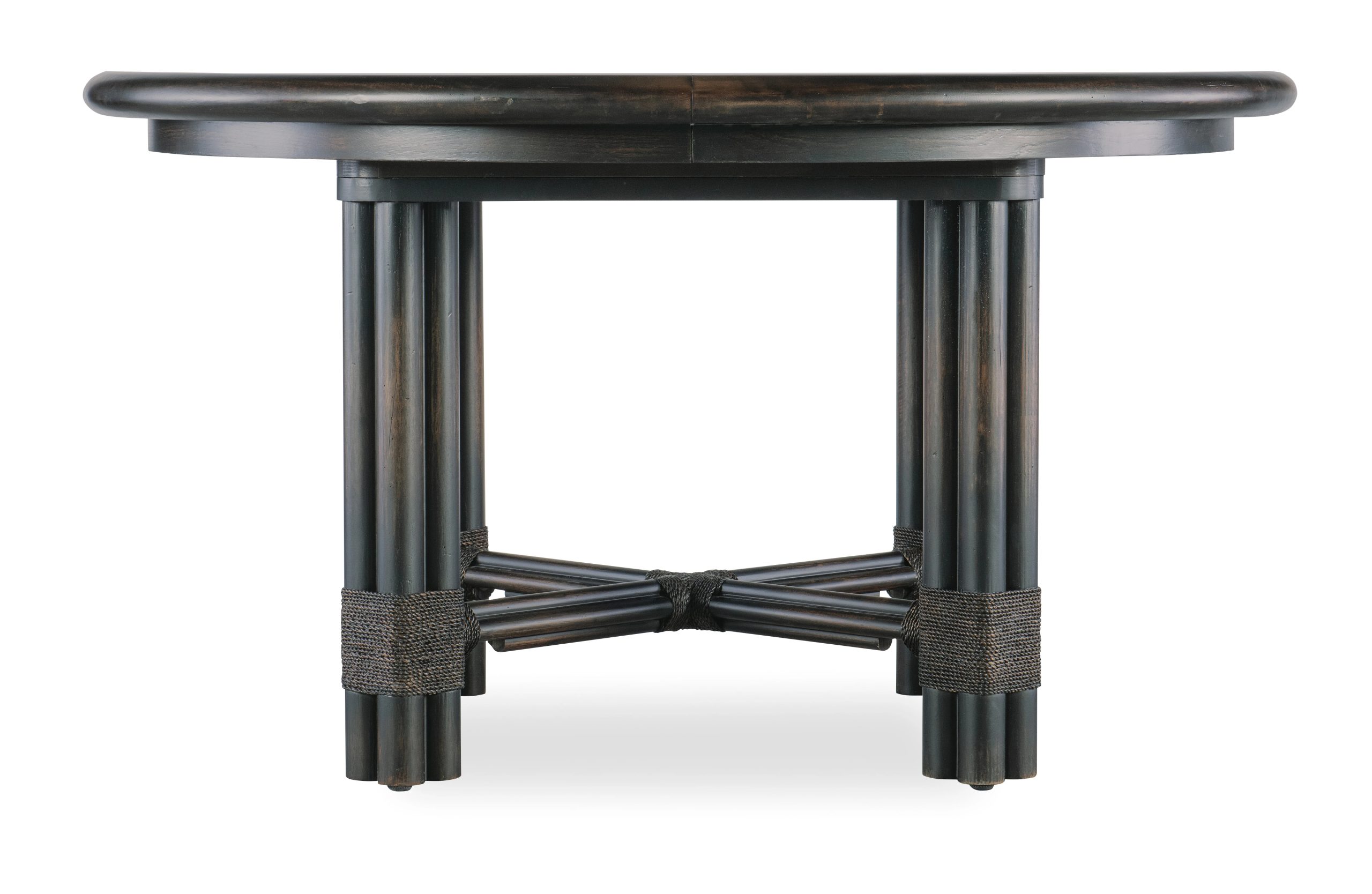 With a tropical retreat-inspired vibe accented by organic details, the Retreat Pole Rattan Round Dining Table has a bundled-pole-designed motif with rope accents. Crafted of Oak Veneers, it features the Black Sand finish, transparent by design to reveal unique grain patterns of the veneer. The tabletop has a Solid Wood edge. When the 20-inch leaf is in place, the table extends to 74 inches and accommodates up to 8 coordinating chairs. Without the leaf, it accommodates up to 6 coordinating chairs.