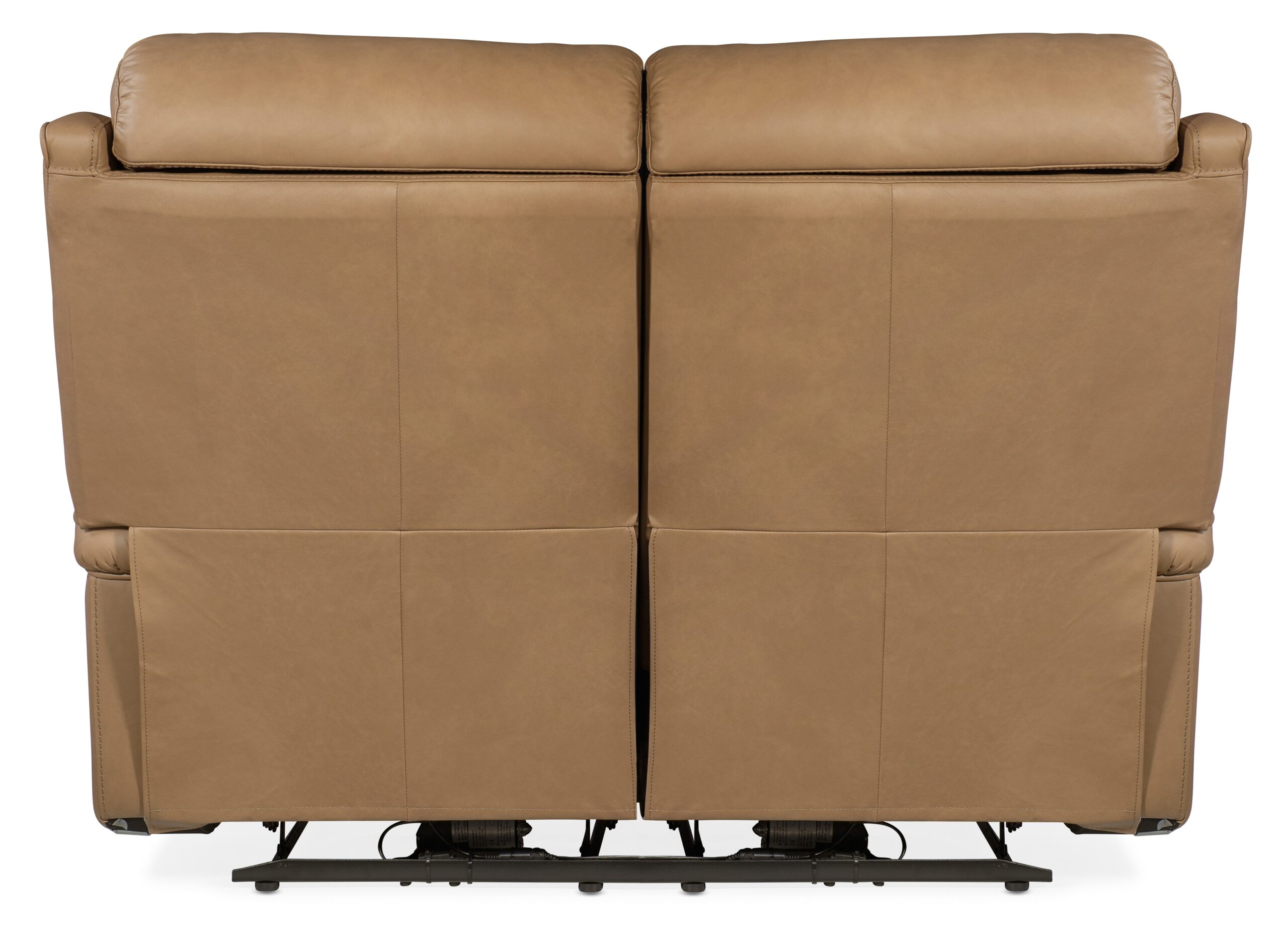 Offered in the scrumptiously soft, butterscotch-colored Sahara Sand semi-aniline top grain leather, the Rhea Loveseat offers power headrest and zero-gravity power recline to make you feel like you’re suspended in ultimate comfort. With a bustle-style back, the loveseat is accented by nailhead trim and features a USB port.
