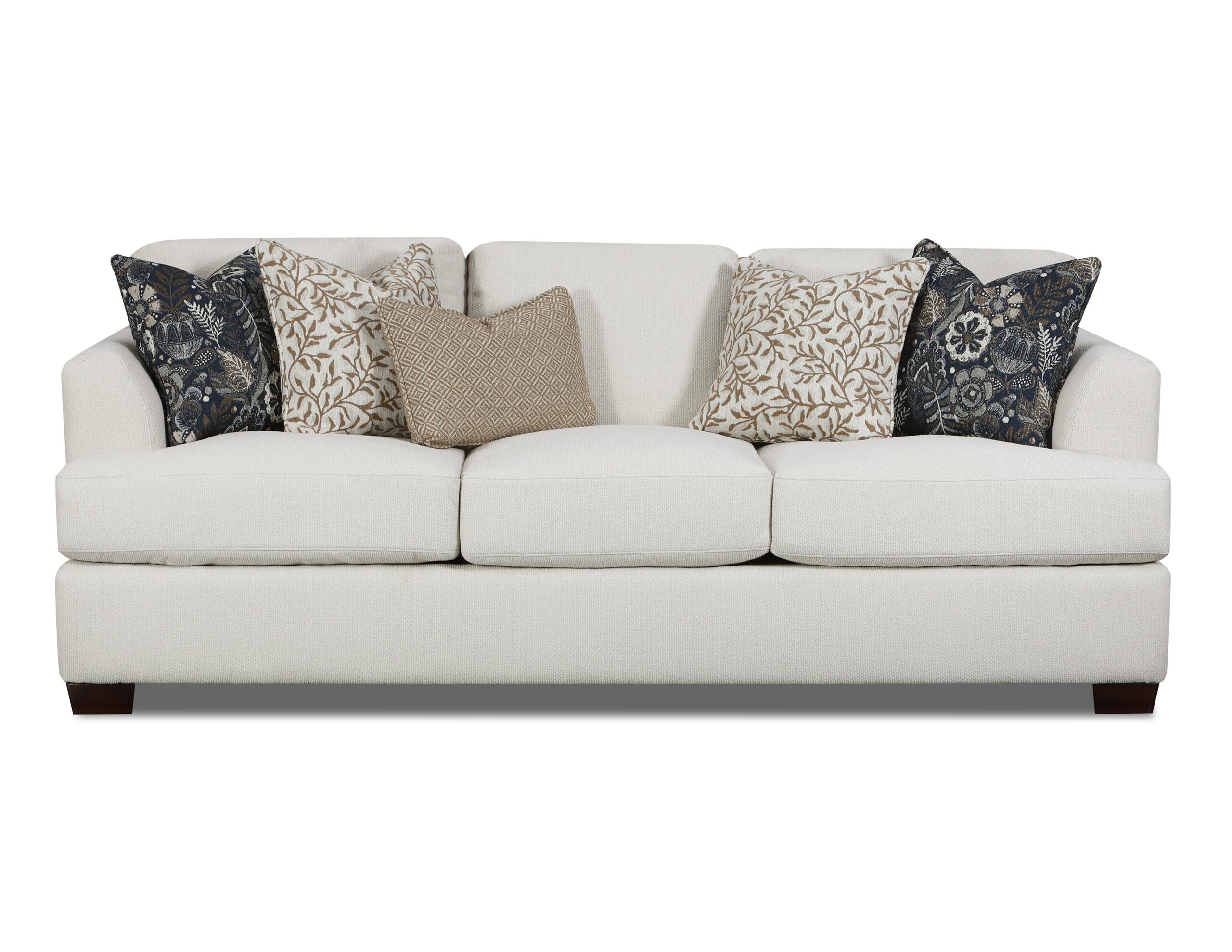 This collection showcases a clean, creamy neutral fabric with a subtle, textured weave for added elegance. The cushion arrangement features an inviting mix of earthy tones, combining botanical prints, geometric patterns, and deep navy floral designs. These accent pillows introduce visual interest and contrast, enhancing the warmth and sophistication of the overall look. The fabric combination exudes a refined, nature-inspired aesthetic perfect for transitional or classic interiors.