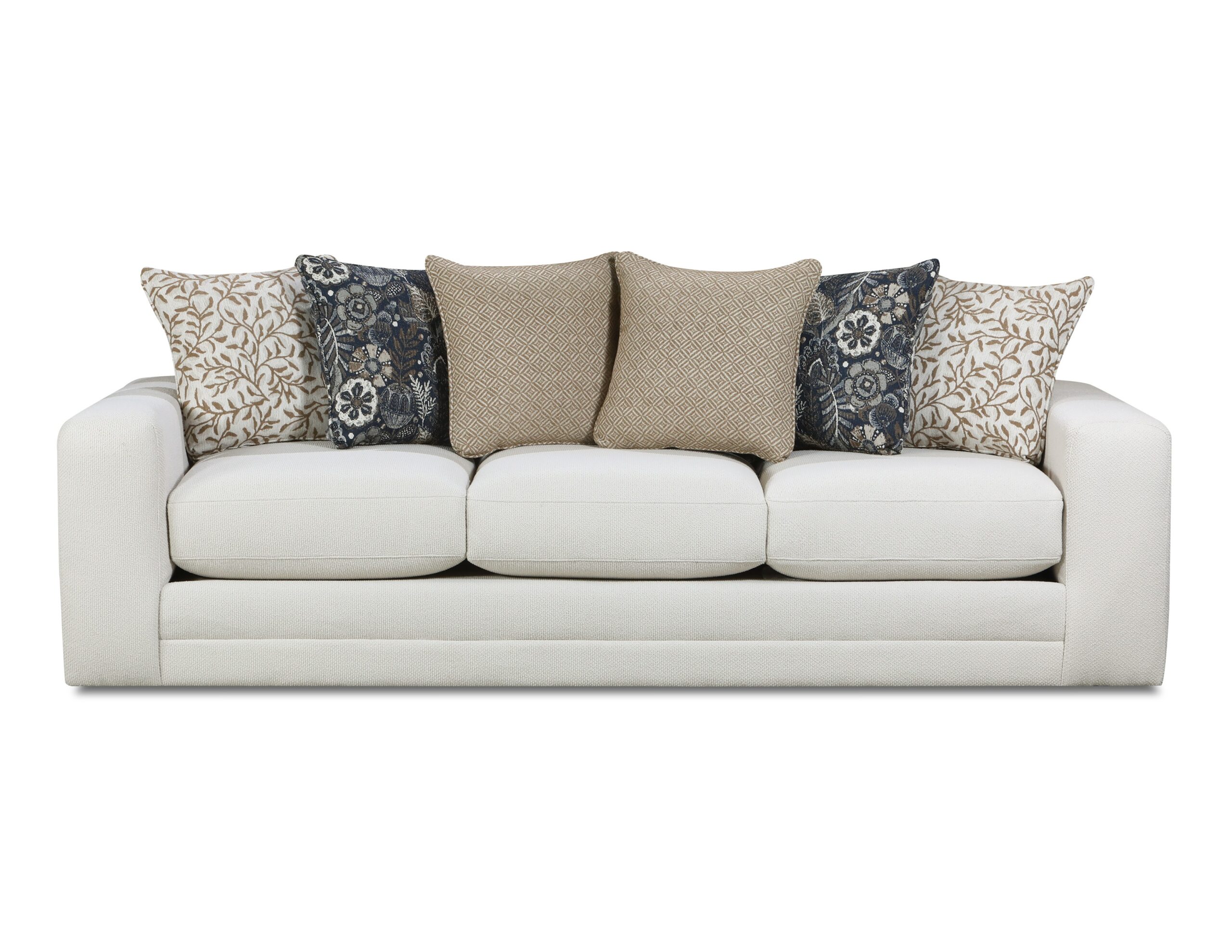 This collection showcases a clean, creamy neutral fabric with a subtle, textured weave for added elegance. The cushion arrangement features an inviting mix of earthy tones, combining botanical prints, geometric patterns, and deep navy floral designs. These accent pillows introduce visual interest and contrast, enhancing the warmth and sophistication of the overall look. The fabric combination exudes a refined, nature-inspired aesthetic perfect for transitional or classic interiors.