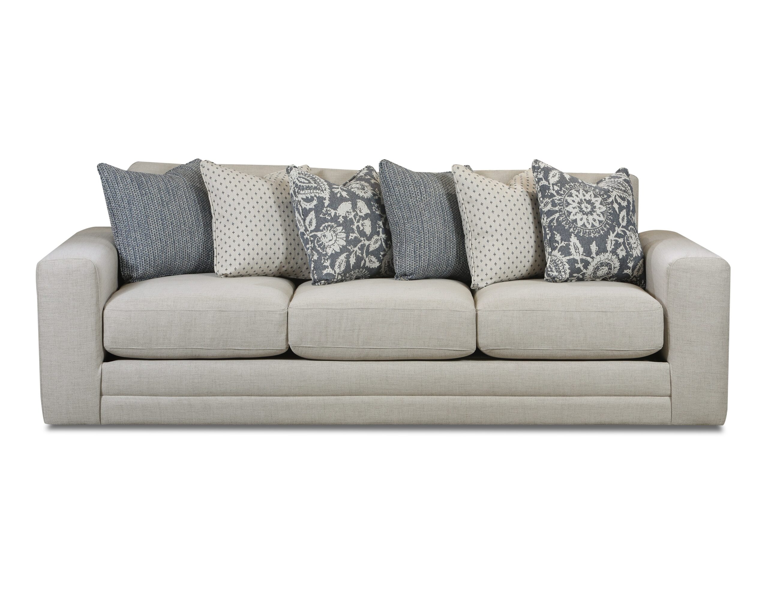 This collection is a soft, linen-textured fabric in a light beige tone that offers a timeless and neutral foundation. The accent pillows blend soft charcoal blues and creams with floral, geometric, and knit-inspired patterns for a layered, sophisticated look. This fabric combination effortlessly merges classic and contemporary elements, creating a calm and balanced visual appeal. It’s an ideal choice for spaces that favor a relaxed yet polished aesthetic.