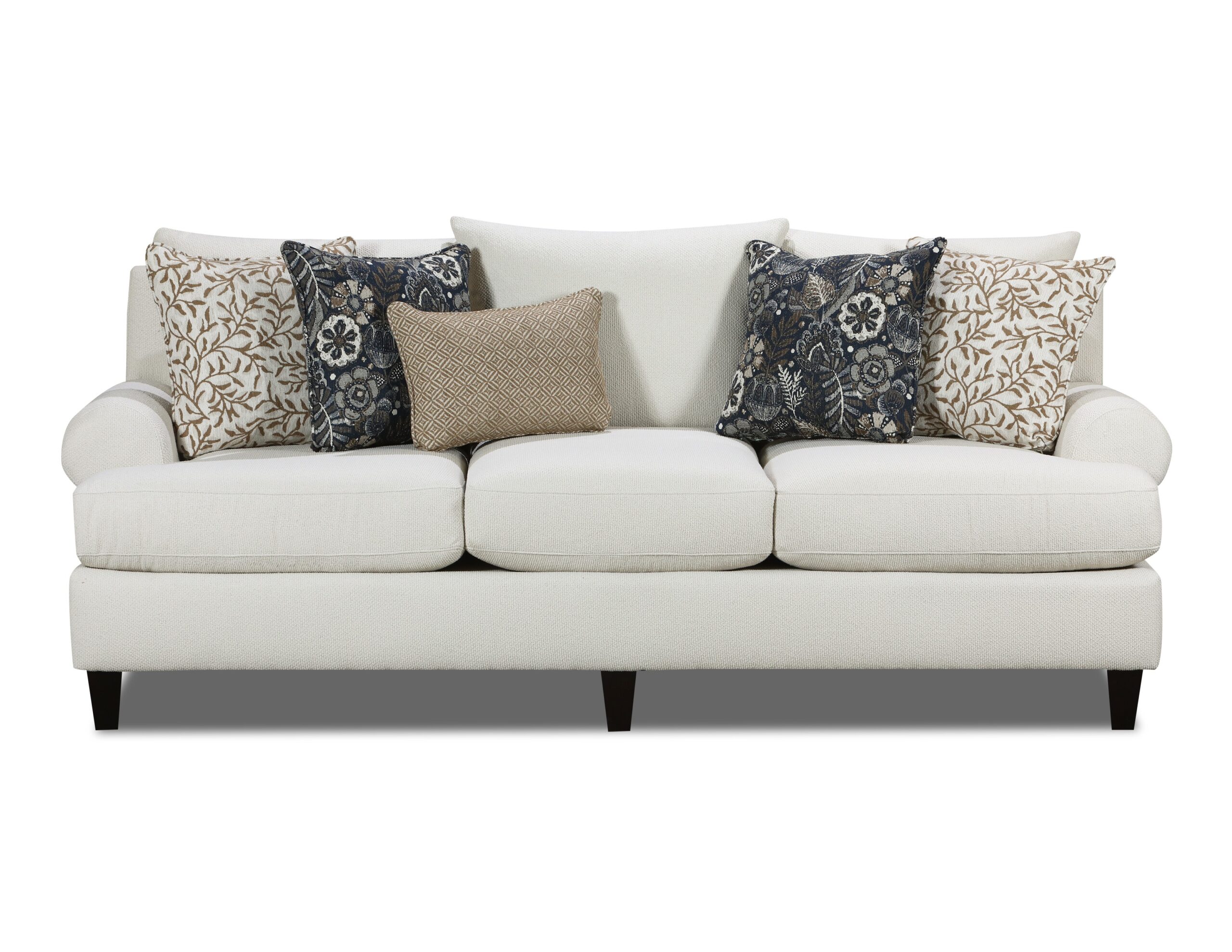 This collection showcases a clean, creamy neutral fabric with a subtle, textured weave for added elegance. The cushion arrangement features an inviting mix of earthy tones, combining botanical prints, geometric patterns, and deep navy floral designs. These accent pillows introduce visual interest and contrast, enhancing the warmth and sophistication of the overall look. The fabric combination exudes a refined, nature-inspired aesthetic perfect for transitional or classic interiors.