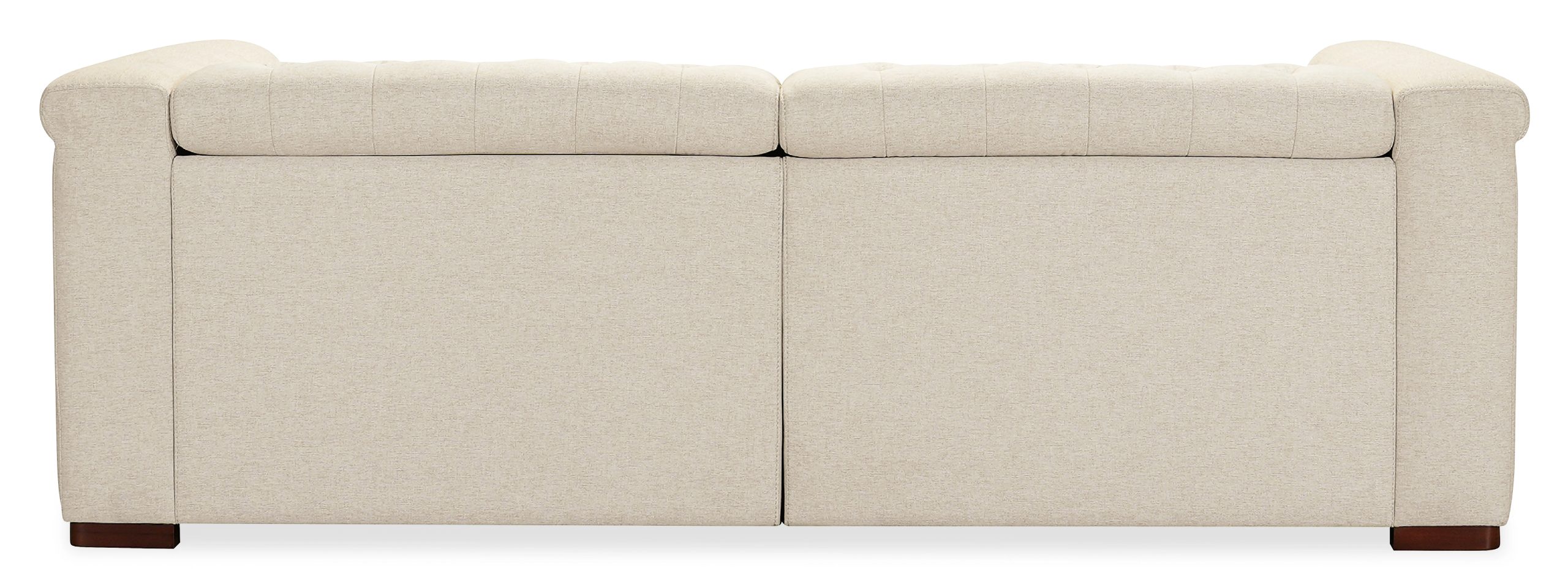 Offering comfort and style, the Savion Deux LAF/RAF 2 over 2 Sofa features power reclining seats at each end and power headrests. Wrapped in Aries Beach performance fabric, this two-cushion sofa blends classic chesterfield tufting with copper-toned nail trim and a dark wood finish. The smooth, variegated sand-colored polyester fabric provides durability and comfort. With high-density foam cushions and a discreet power recline function, this sofa delivers both elegance and convenience for your living space.