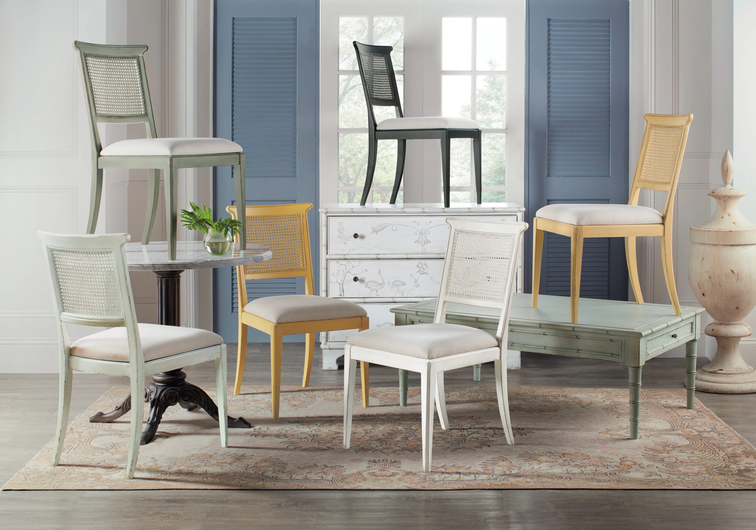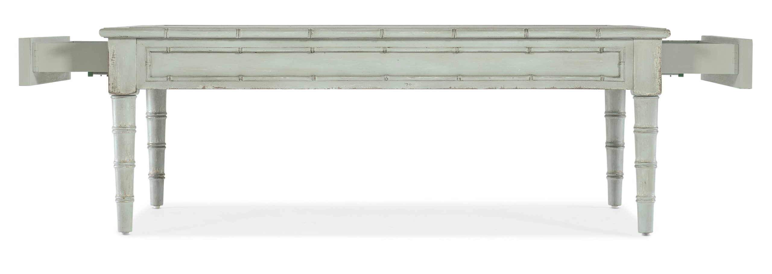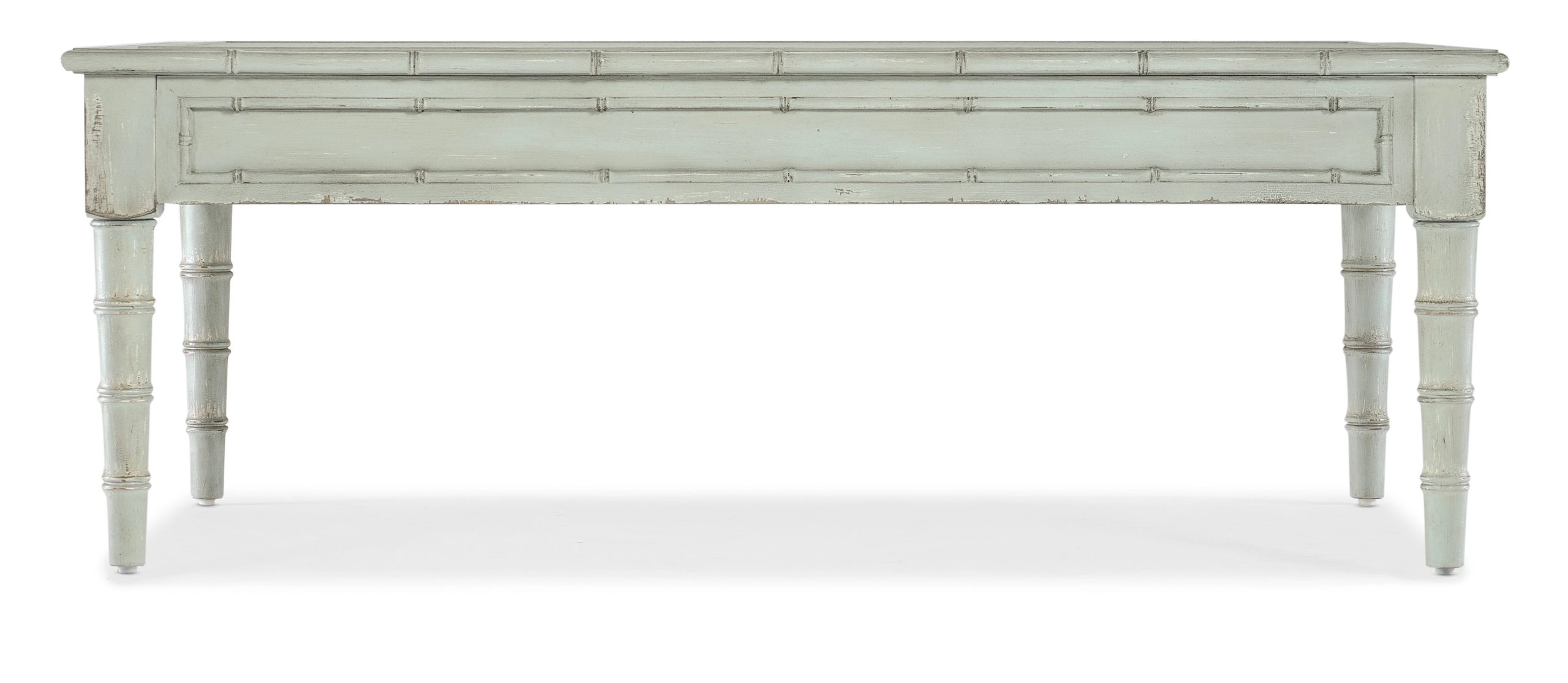 Inspired by the tropical craftsmanship of the West Indies and classic British and Dutch Colonial design periods, the Charleston Rectangle Cocktail Table has Bamboo-designed accents. Crafted of Maple Veneers and Resin, it is finished in Haint Blue, a soft color which can be found on the ceilings of porches and entryways, window shutters and doors in the American South, dating back more than 200 years from the Gullah folklore that held the color kept “haints” or spirits from entering homes and dwellings.